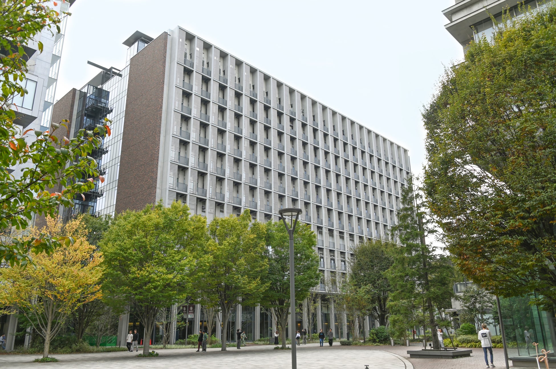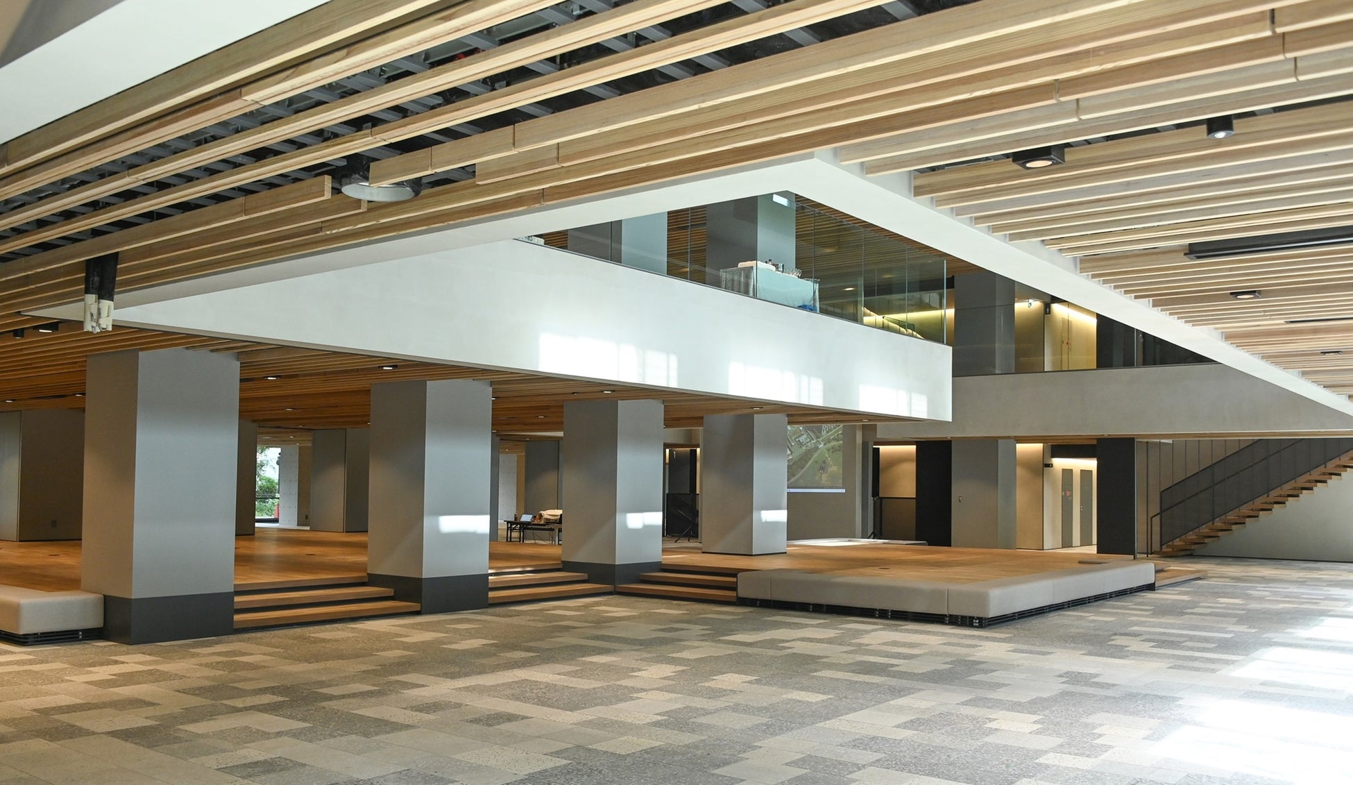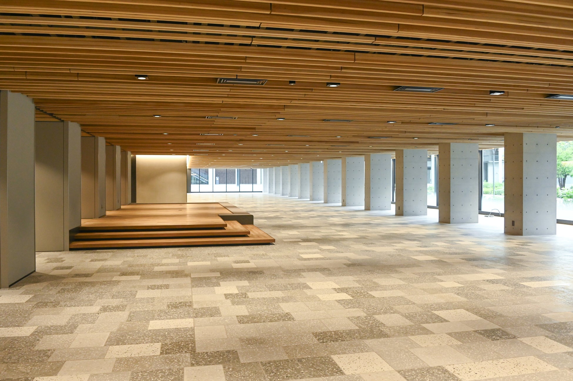 また、共用部は天然木に不燃性の加工を施した天井材を用いております。不燃木を積極的に活用することで、脱炭素社会の実現にも貢献します。床材のテラゾータイルは、本学の各キャンパス(北海道・長万部、神楽坂、野田、葛飾)から集めた骨材を織り交ぜており、全学の繋がりを象徴しています。