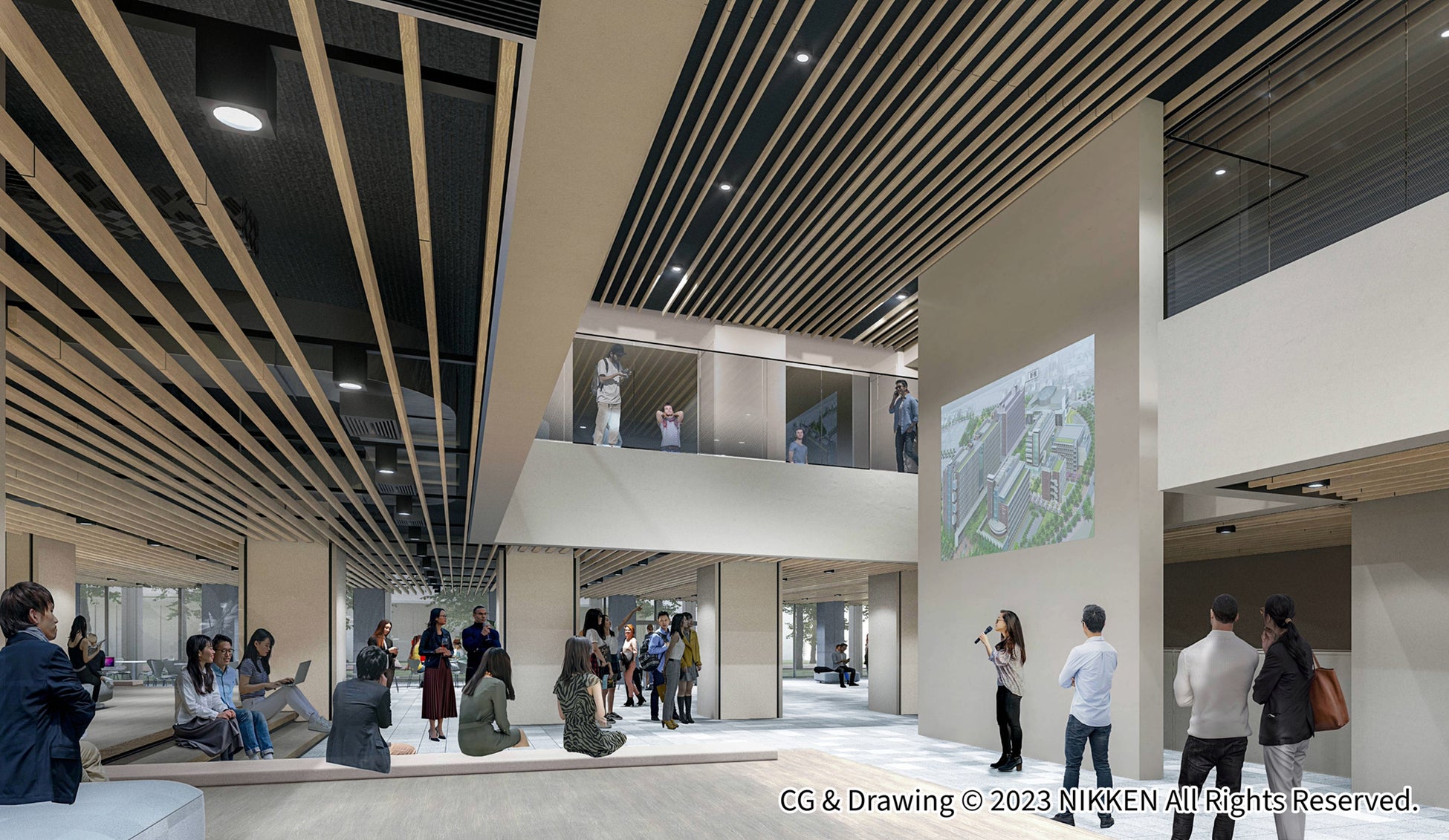 共用空間となる1階には、巨大なインフォメーションウォールが配置されたラーニングスクエアを中心に、エントランスホールから隣接する葛飾にいじゅくみらい公園まで吹抜で開放的な空間が展開されます。インフォメーションウォールは大学からの発信にとどまらず、発表や勉強会にも活用できるよう整備していく予定です。
