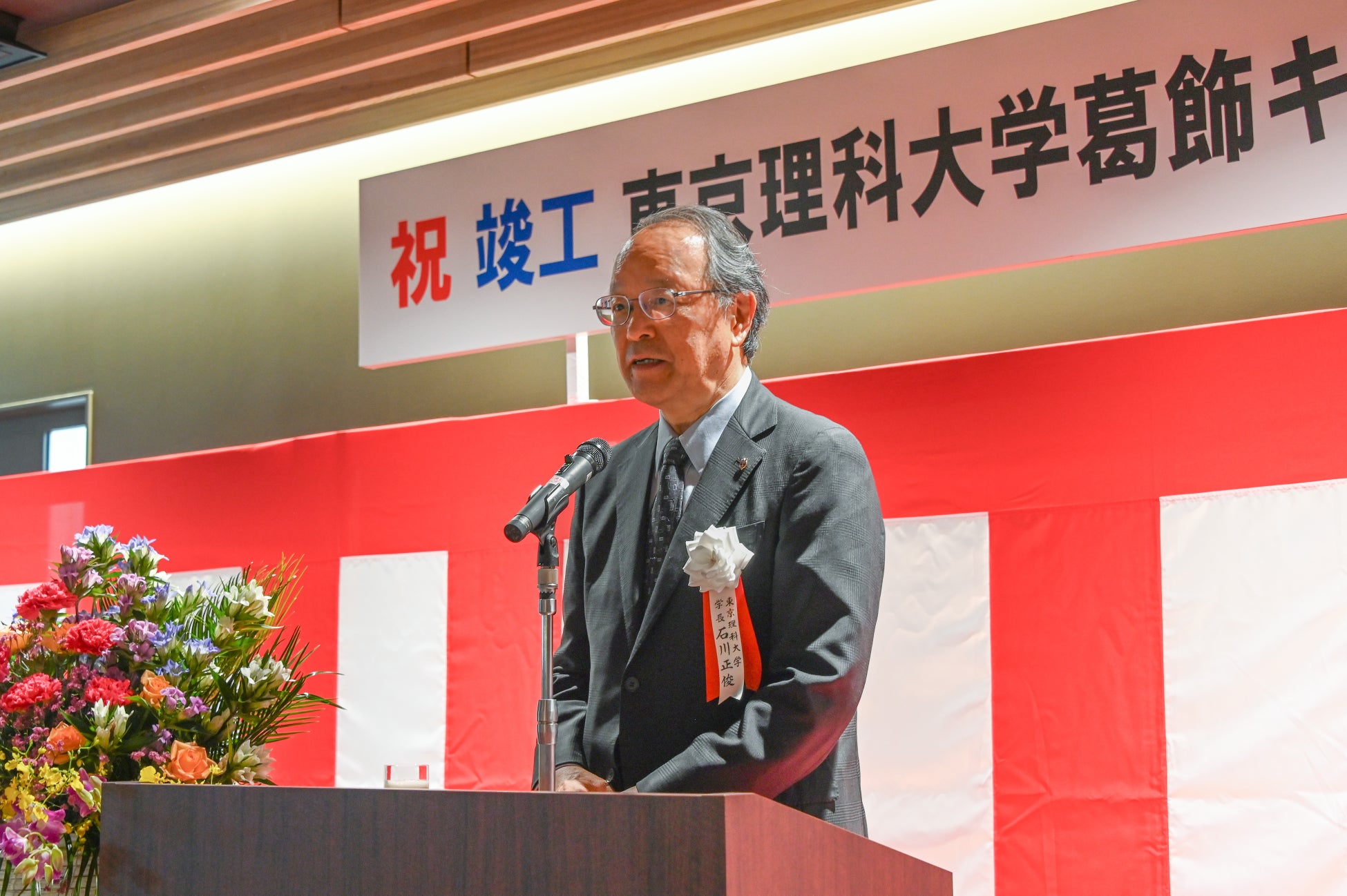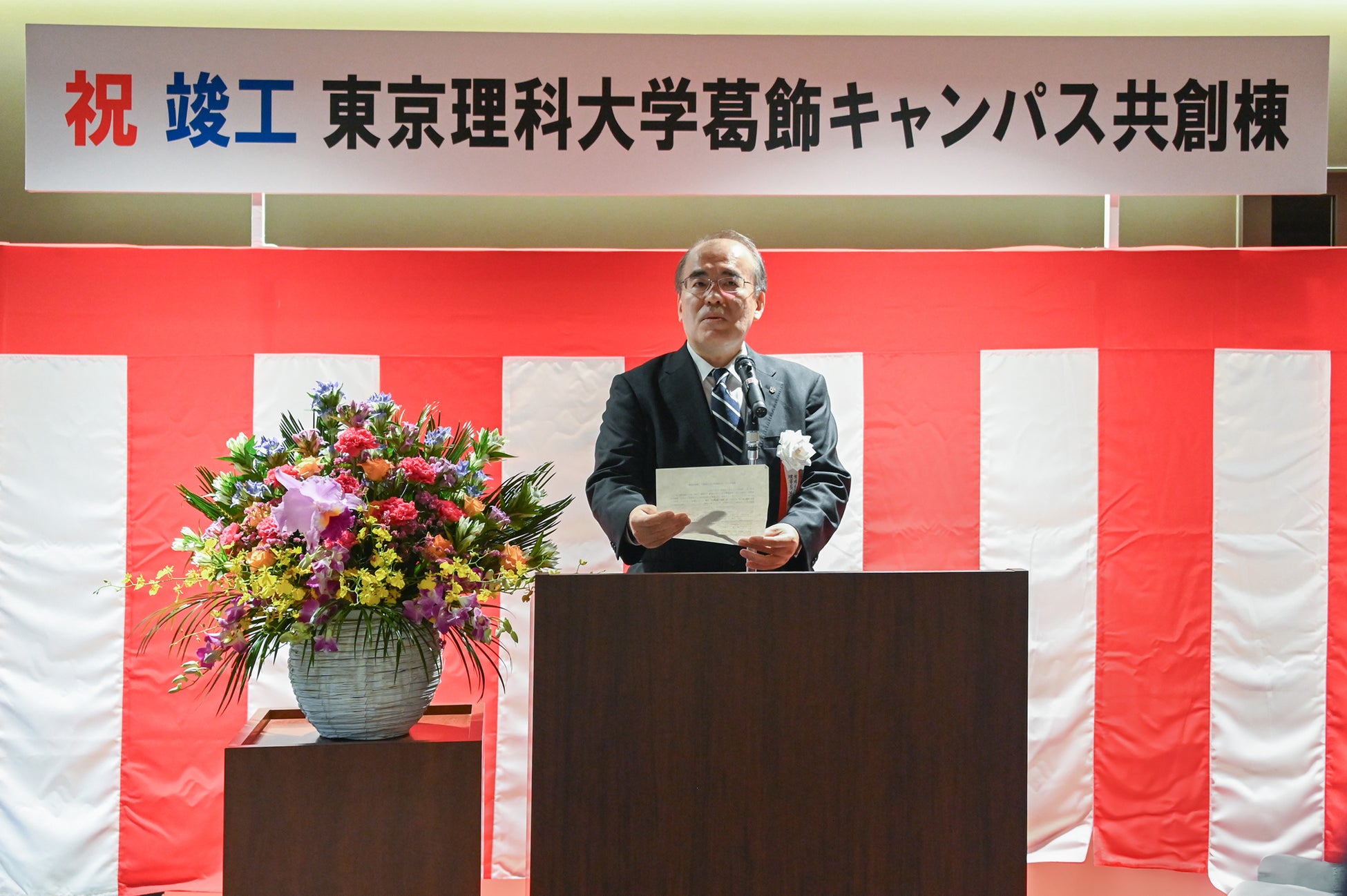 2024年10月17日(木)に行われた竣工式において、浜本隆之理事長は「葛飾キャンパスは先端融合分野を推進するイノベーションキャンパスとして発展し、昨年開設10周年を迎えました。共創棟の活用を通じて、今後も様々な価値が共存する場として更なる進化を遂げていきたい」と述べました。また、石川学長は「2031年に迎える創立150周年に向けて、本学は世界の理科大を目指しています。産学官金での共創をもとに、世界を変えるようなイノベーションを葛飾キャンパスから創出していきたい」と未来に向けた抱負を語りました。