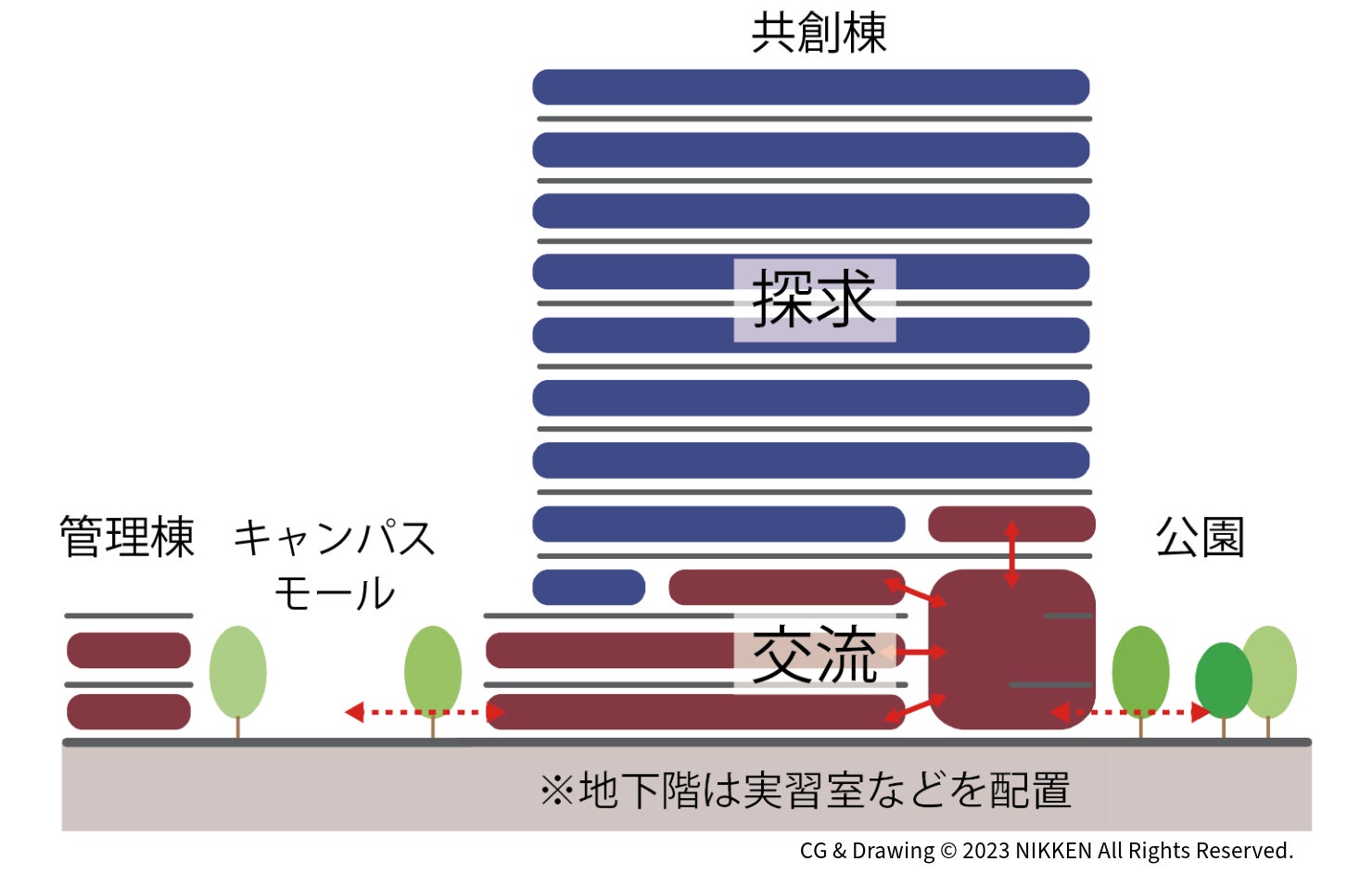同キャンパスは2013年に開設し、これまで工学系の学部が所在するキャンパスとして発展してきました。共創棟は薬学部の研究室・教室としての利用にとどまらず、薬工連携をはじめ、分野を超えた教育の実施や研究における新たな連携の推進も目指しています。また、低層部はラーニングスクエアや学生ラウンジなどが配置され、学生の新たな交流の場を創出します。