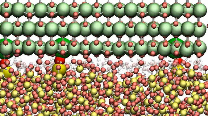 当社は、CMPスラリーによる半導体基板の研磨工程のシミュレーションを実施するため、最先端のNNP技術を用いました。その結果、ナノメートル(*4)スケールで複雑な界面の挙動を精密に可視化することで、実験だけでは捉えにくい複雑な研磨メカニズムを詳しく理解することができました。