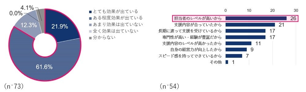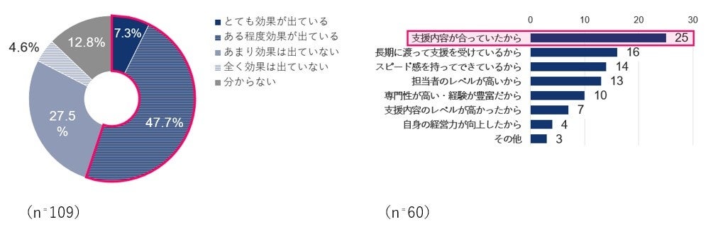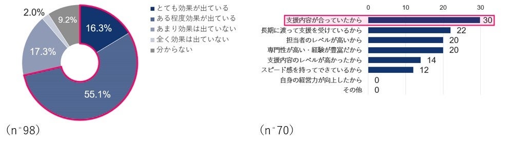 3つの事例に絞って伴走支援の効果、ならびにその理由について検証した結果、「売上拡大」については、「とても効果がでている」、「ある程度効果がでている」を合わせ55.0%が効果を実感しており、理由としては「支援内容が合っていたから」が多いです。
