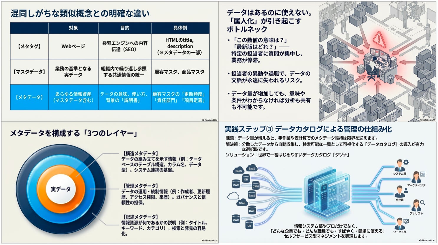 本資料では、データのサイロ化や属人化という慢性的な課題を解消し、データカタログなどのツールを真に機能させるための「メタデータの設計・管理」のノウハウを、技術偏重にならずビジネス部門にも理解できるよう分かりやすく解説しました。