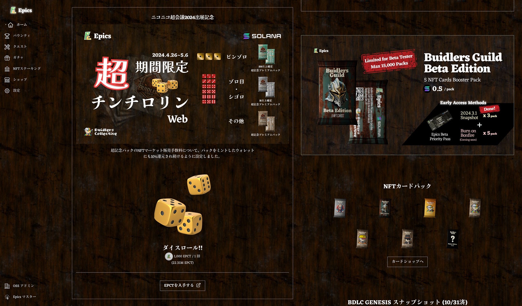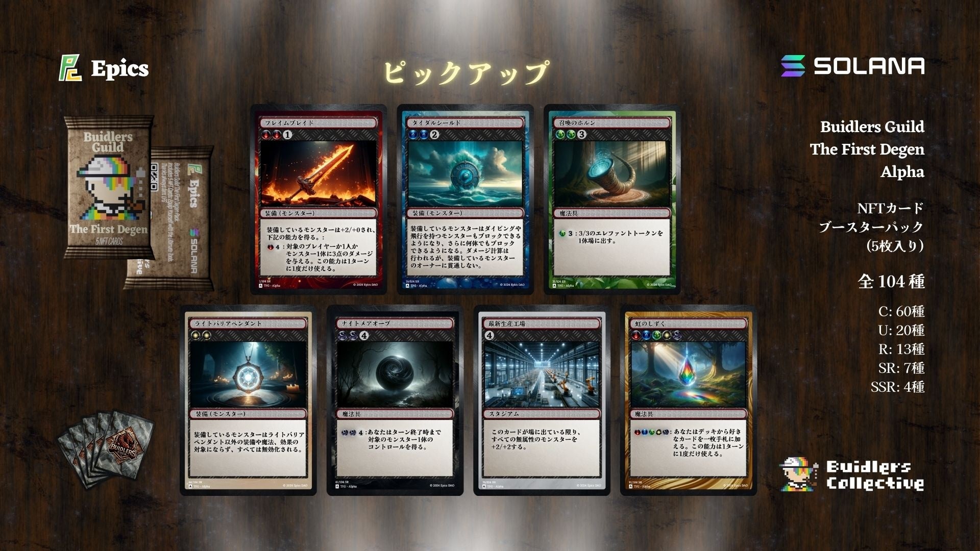 超チンチロリンにて景品となっている超限定 NFT カードパックには、Epics プラットフォーム上にて開発中の「Buidlers Guild」という Web3 トレーディングカードバトルゲームにて使用できる NFT カードが封入されています。