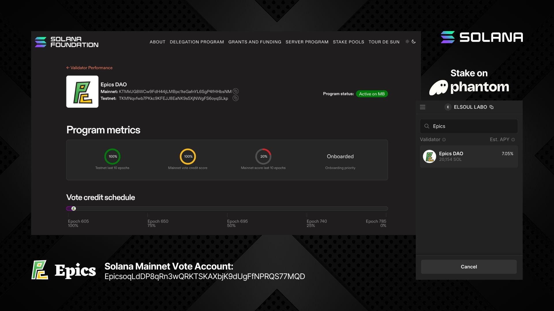 ステーク先となる Vote Account は「EpicsoqLdDP8qRn3wQRKTSKAXbjK9dUgFfNPRQS77MQD」で、Phantom ウォレット等の Solana バリデーターへのステーキング機能をお持ちの皆様は、「Epics」と検索いただくことで、「Epics DAO」として私達のバリデーターを選択いただけます。現在、APR(年利) 7.05%のステーキング報酬を提供しております。