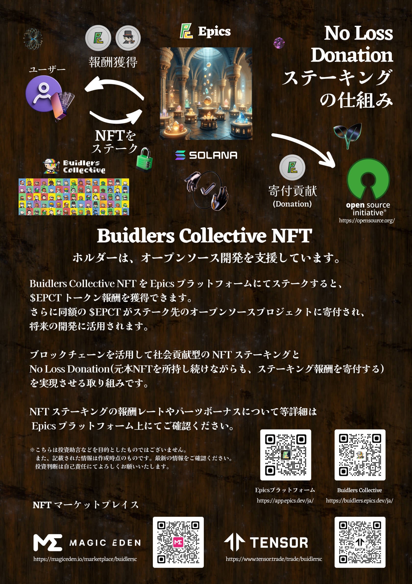 Epics プラットフォーム上ではオープンソースへの貢献に対して、NFT カードゲーム「Buidlers Guild」で使用できるカードパックを入手することができます。開発・投資・広報それぞれの仕事によって手に入るカードの種類が違うため、それぞれの仕事のクリアをみんながサポートする状況が生まれます。カードゲームを遊ばないユーザーも、カードゲームプレイヤーからの需要があるカードパックの入手には価値があり、実際に価値の高いカードが当たればマーケットにて良い取引が可能になるため、どのポジションでも楽しめるプラットフォームを構築できます。