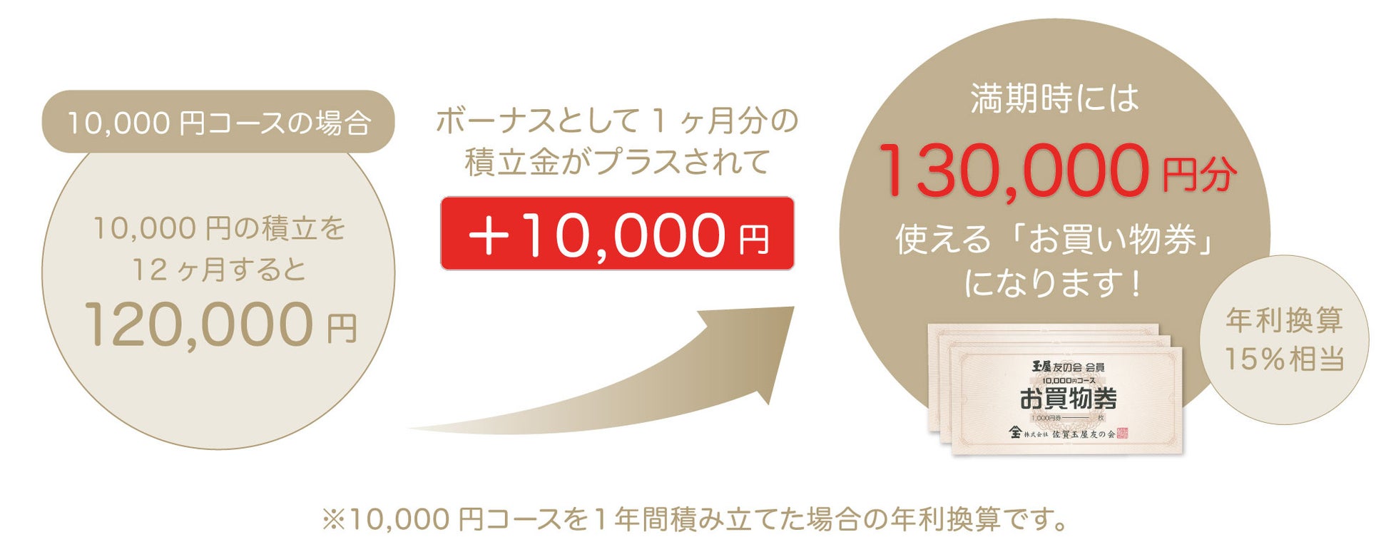 毎月10,000円を1年間積み立た場合、ボーナスとして1ヶ月分の積立金がプラスされ、満期時には130,000円分の「お買物券」をお渡しします!