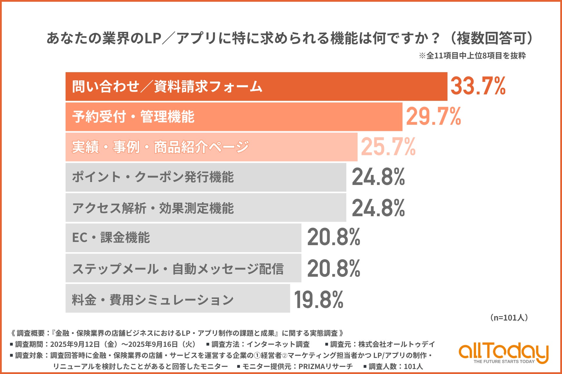 「あなたの業界のLP/アプリに特に求められる機能」について尋ねたところ、『問い合わせ/資料請求フォーム(33.7%)』が最も多く、『予約受付・管理機能(29.7%)』『実績・事例・商品紹介ページ(25.7%)』と続きました。