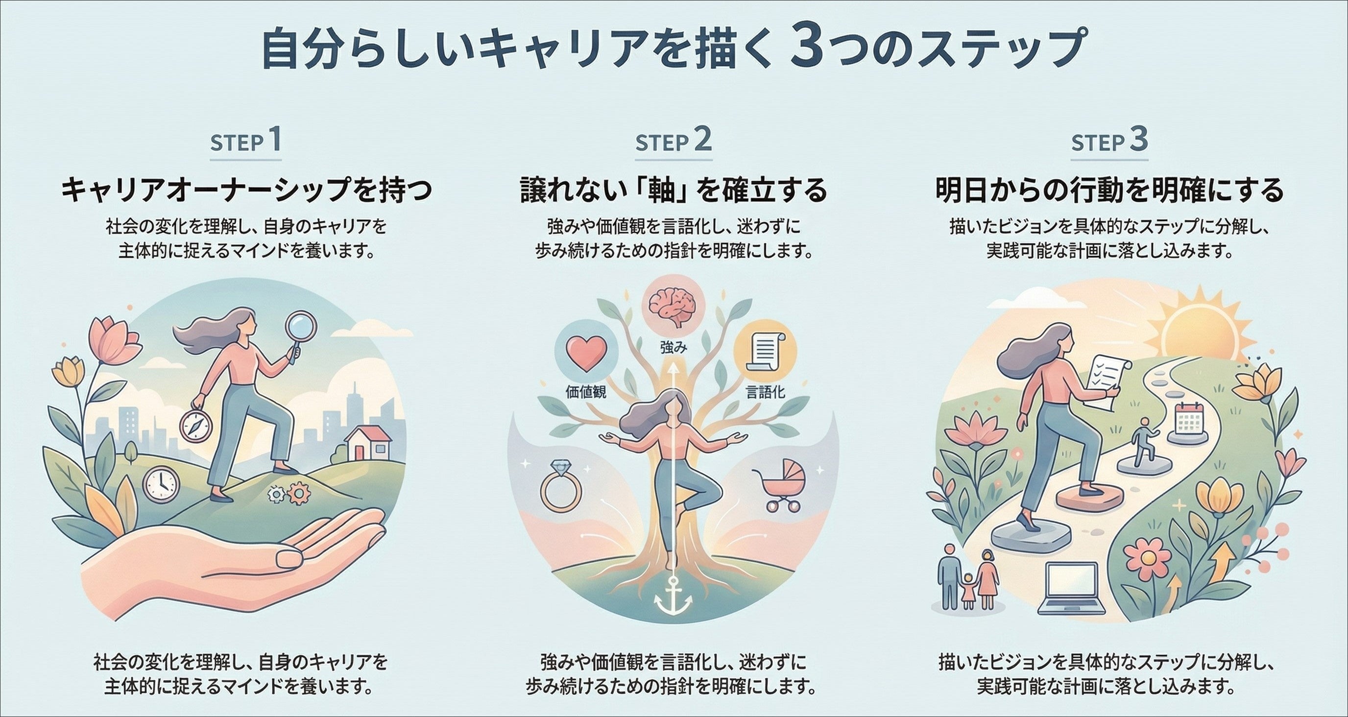 スキルの棚卸しや価値観の言語化を通じて、どのような状況下でも迷わずに歩み続けるための指針を策定します。