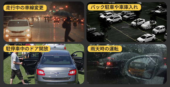 ①雨の日でも夜間でも、左右の道路状況がはっきり見えます!