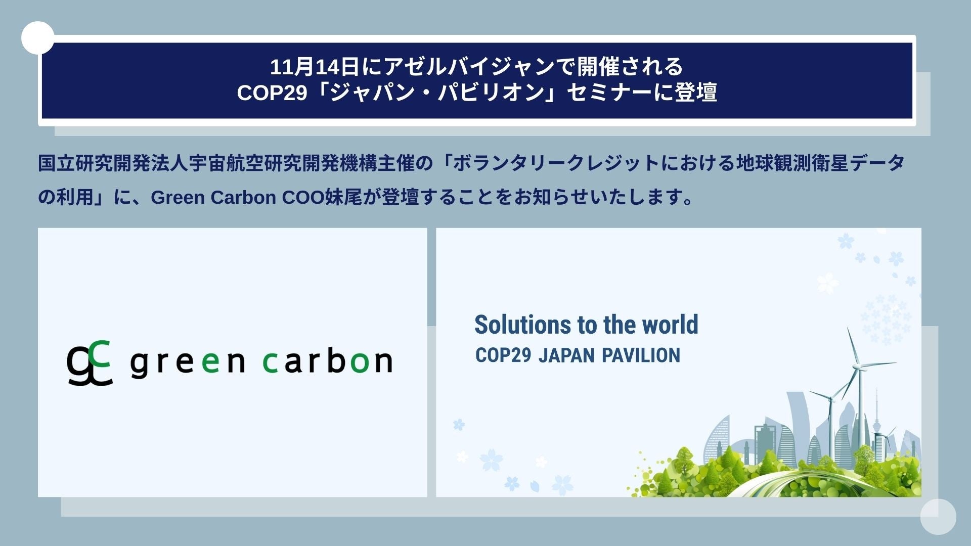 Green Carbon株式会社は、11月14日にアゼルバイジャンで開催されるCOP29「ジャパン・パビリオン」セミナーに登壇