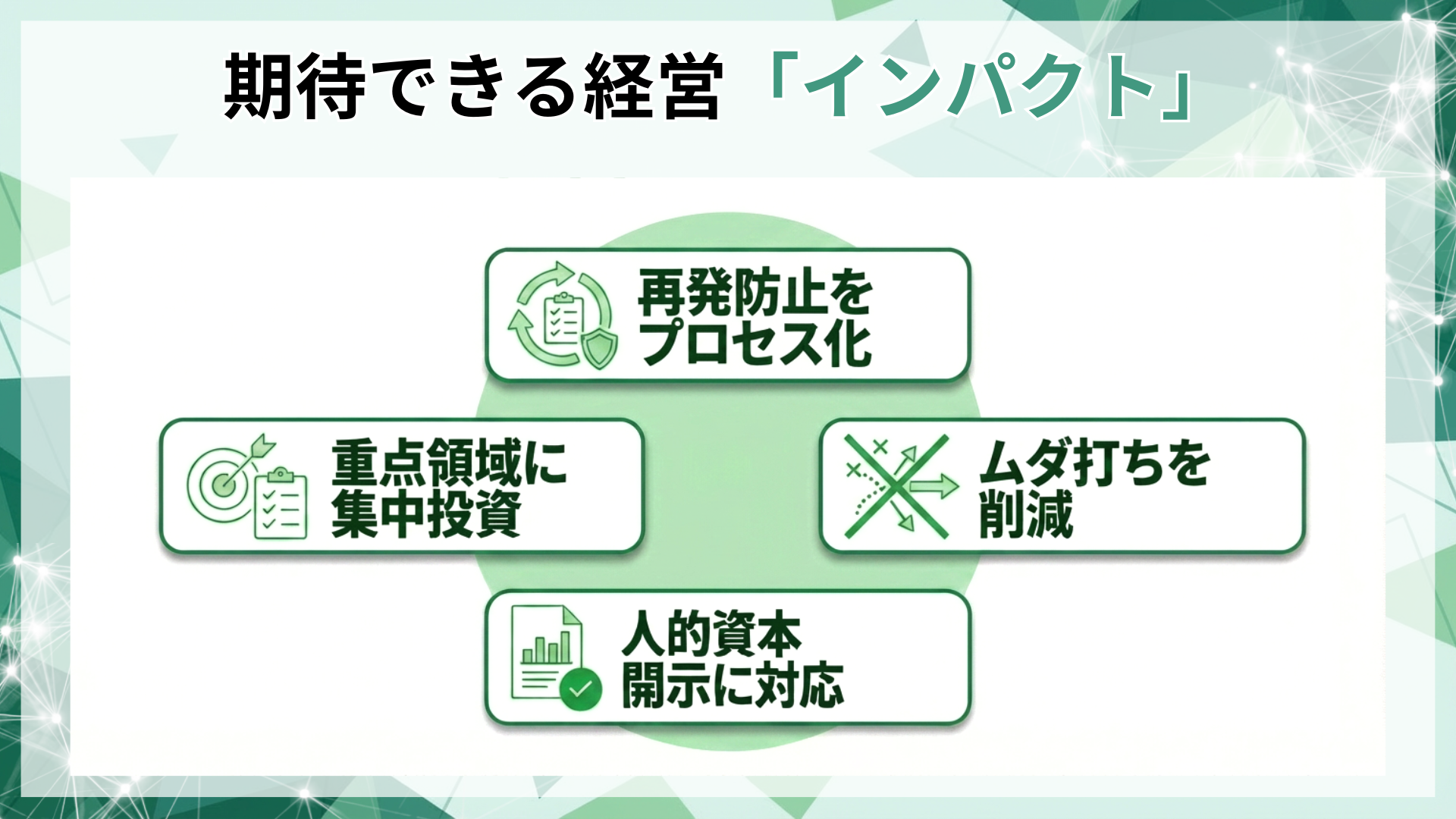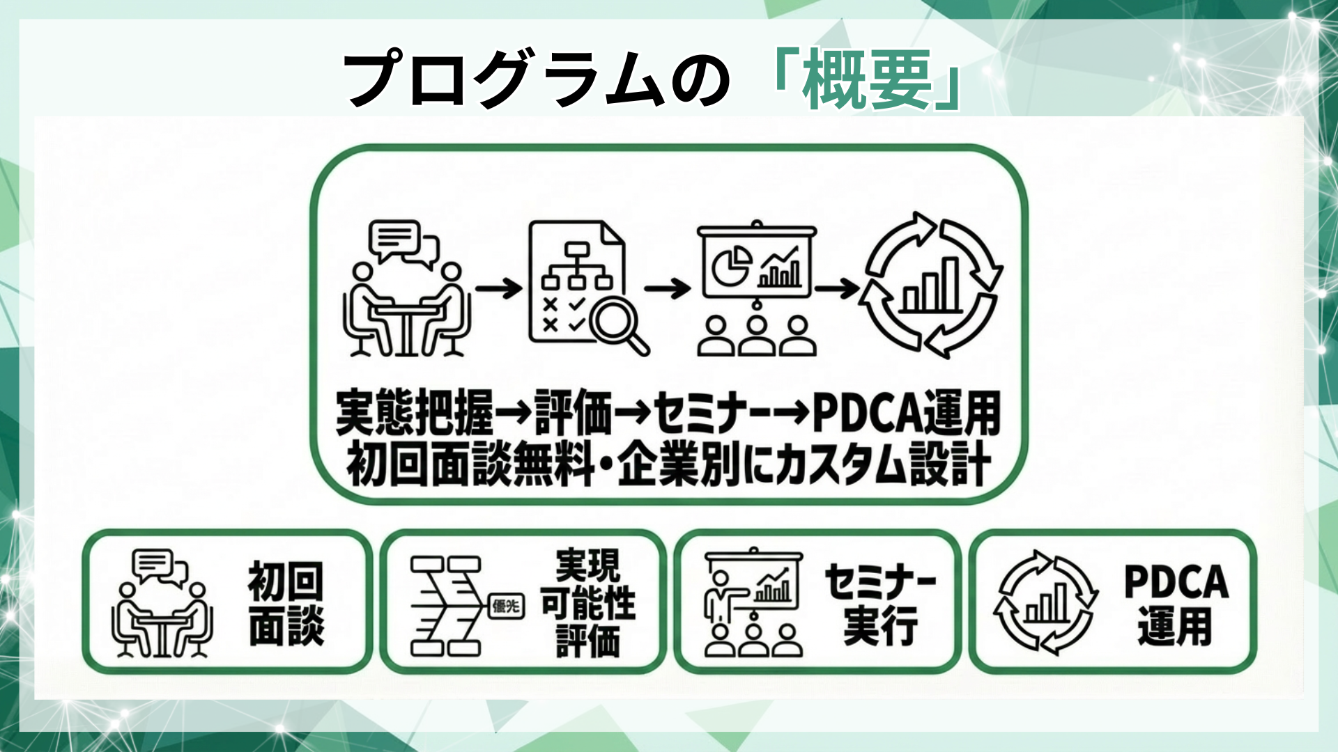 本プログラムは、人的資本可視化指針の考え方(ガバナンス/戦略/リスク管理/指標と目標)を踏まえ、施策の実行だけで終わらせず、現場実態の把握→対策の優先順位付け→実行(セミナー)→運用改善までをプロセスとして設計します。