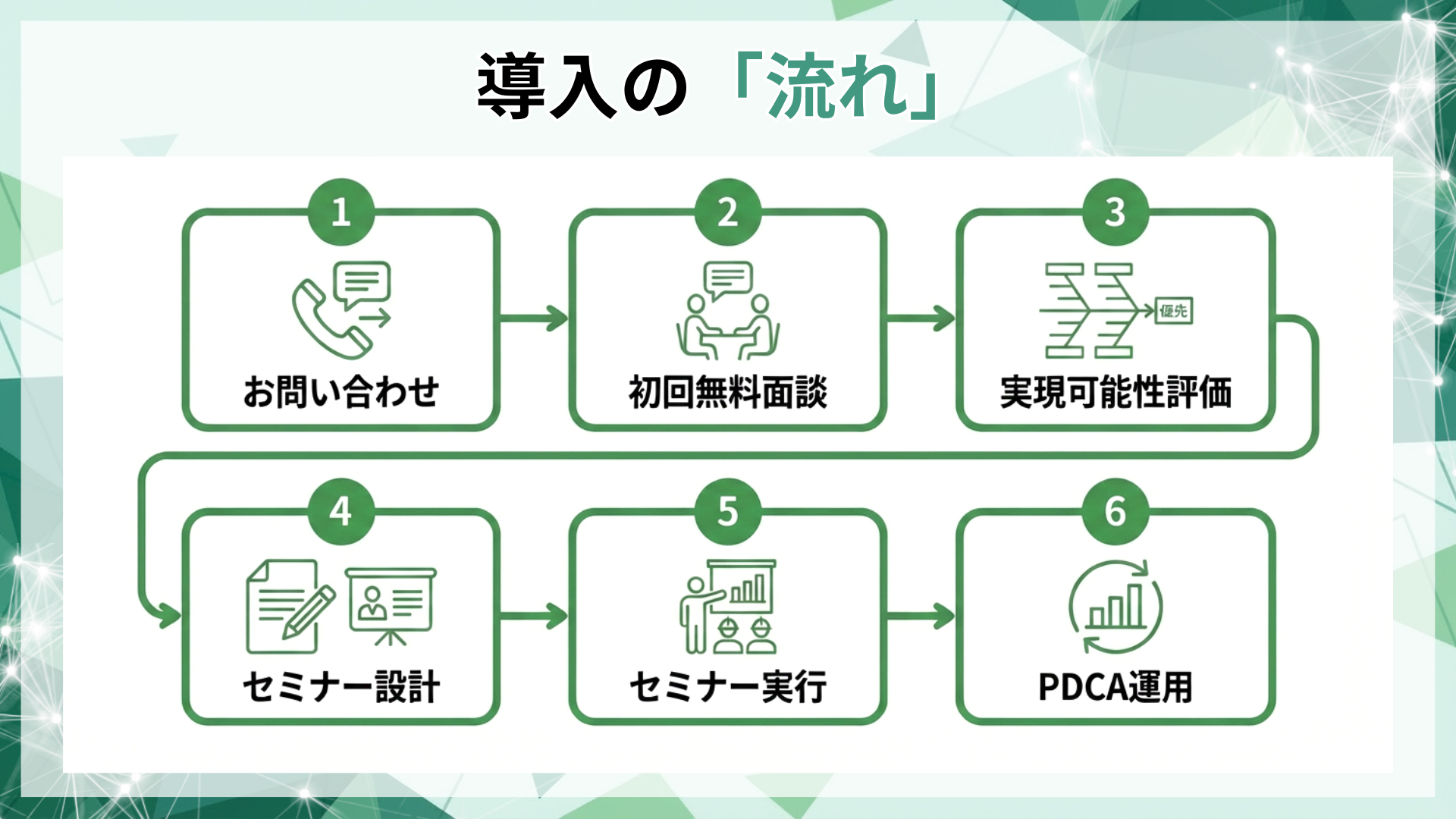初回無料面談では、災害の型と発生局面、改善余地、実行可能性の評価まで整理し、効果が見込める場合にセミナー実行へ進みます。