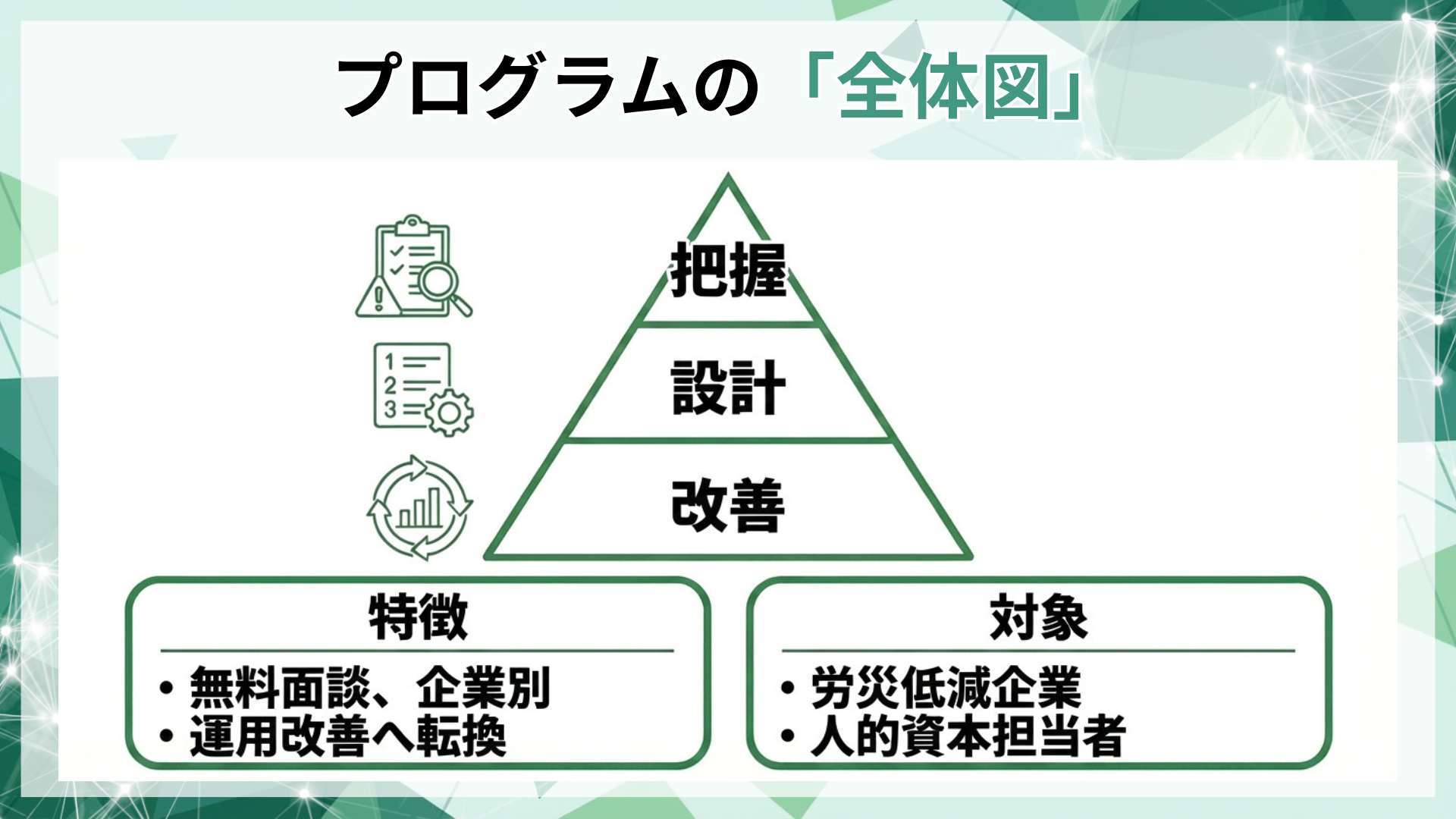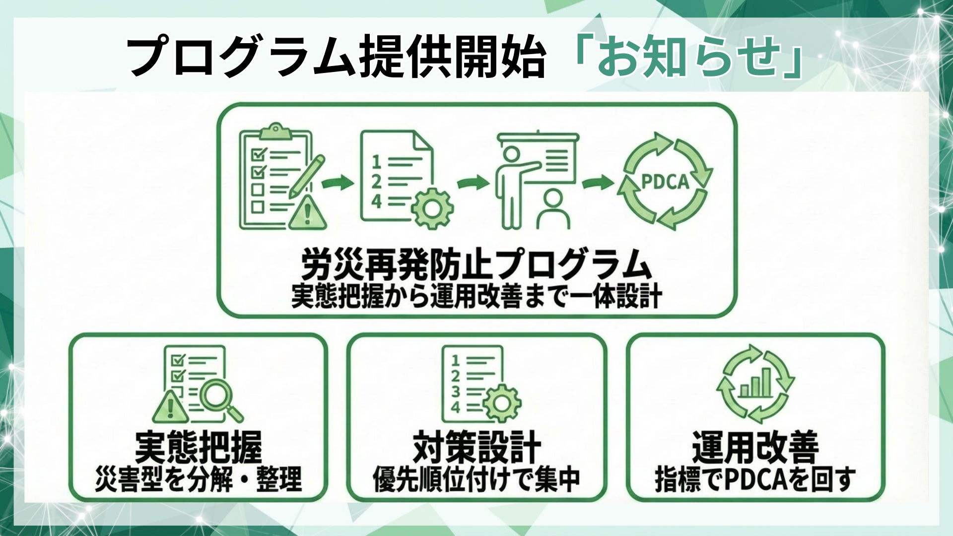 本プログラムは、労働災害を「起きた後の対応」ではなく「再発防止の運用」として設計し直す支援です。初回面談は無料で実施します。