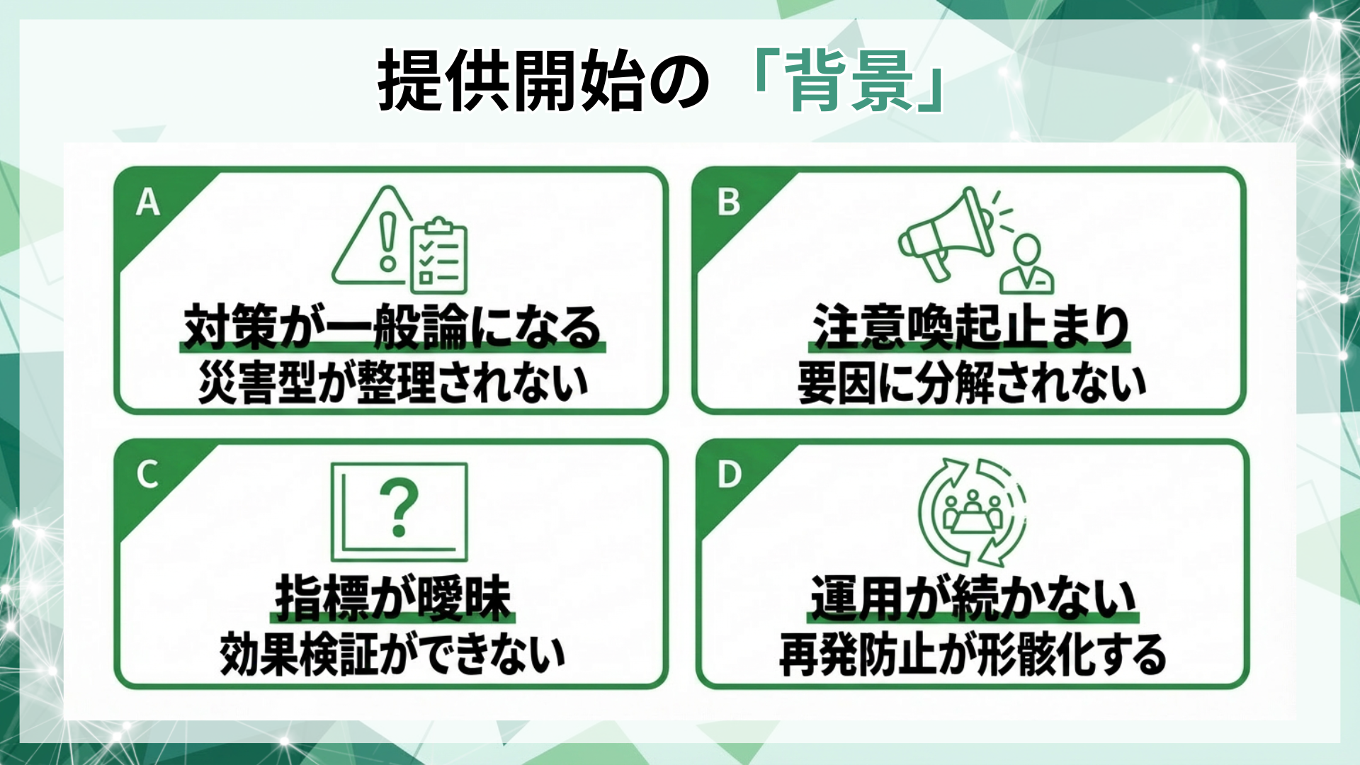 一方、健康・安全領域の中でも労働災害は、企業の事業継続・現場稼働・品質に直結し得るにもかかわらず、次の理由で「改善運用」に落ちにくいテーマです。