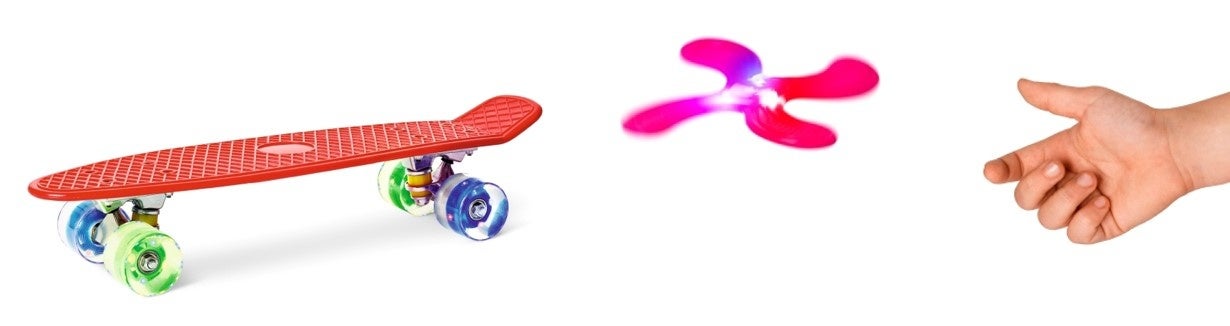 遠くに飛ばしてもどこにあるか一発で見つかるフライングディスクに、走る時だけ光るスケートボード、テンションあがります。