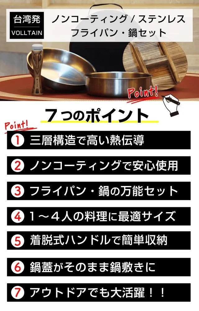 家でも外でもノンコーティング・ステンレス【VOLLTAINフライパン・鍋セット】