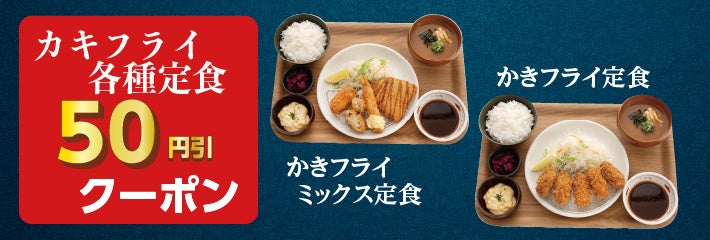ただいま、「定食屋宮本むなし」で利用できる「カキフライ各種定食50円引クーポン」を配信しています。