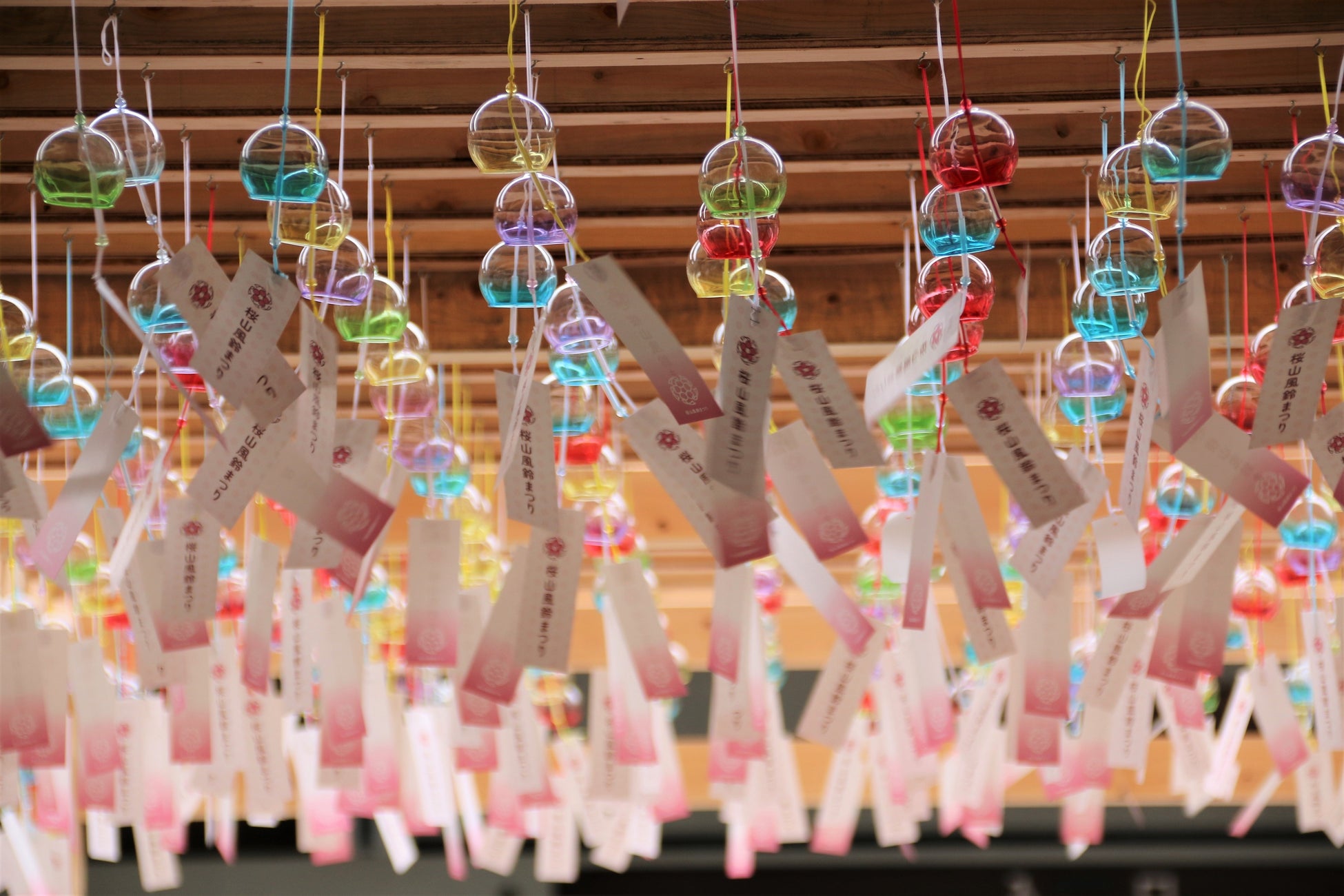 4年前のコロナ禍に厄ばらいを願って始まったこのイベントは、今では飛騨高山の新しい風物詩として定着しつつあり、今年も7月20日(土)から8月24日(日)まで、櫻山八幡宮境内絵馬殿に約2,000個の風鈴を飾ります。