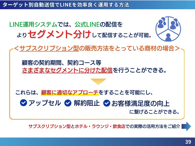 LINE運用システムでは、より詳細にセグメント分けした公式LINEからの自動メッセージ配信が可能です。例えば、サブスクリプション型商材の場合、顧客の契約期間、契約コース等さまざまなセグメントに分けた配信を定常送信することもできます。これらは、顧客毎の適切なアプローチを可能にし、アップセルや解約阻止、お客様満足度の向上に寄与します。