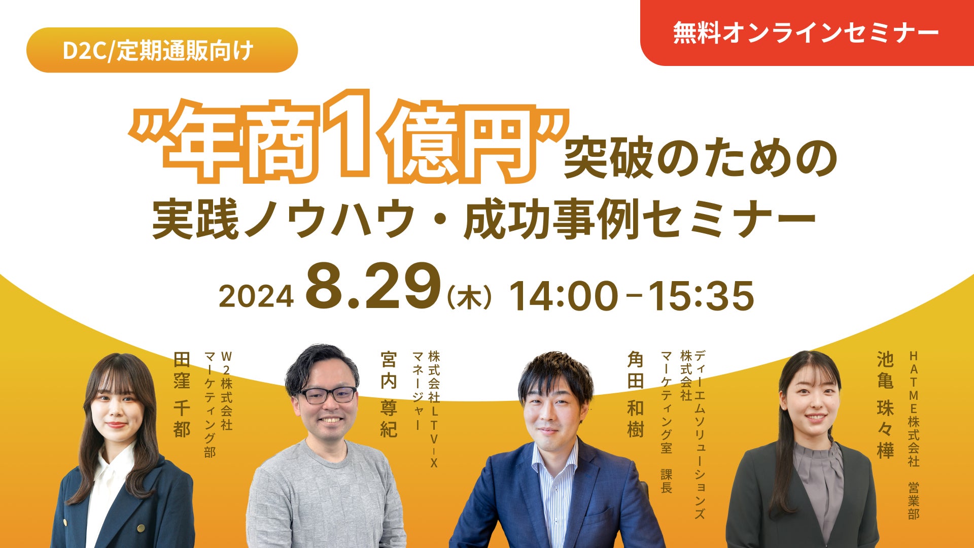 マーケティングアソシエーション株式会社の子会社であるHATME株式会社(本社:東京都台東区 代表取締役:中園広和、以下当社)は2024年8月29日(木)に、ウェブセミナー「【D2C/定期通販向け】”年商1億円”突破のための実践ノウハウ・成功事例セミナー」を、W2株式会社、株式会社LTV-X、ディーエムソリューションズ株式会社と共催いたします。