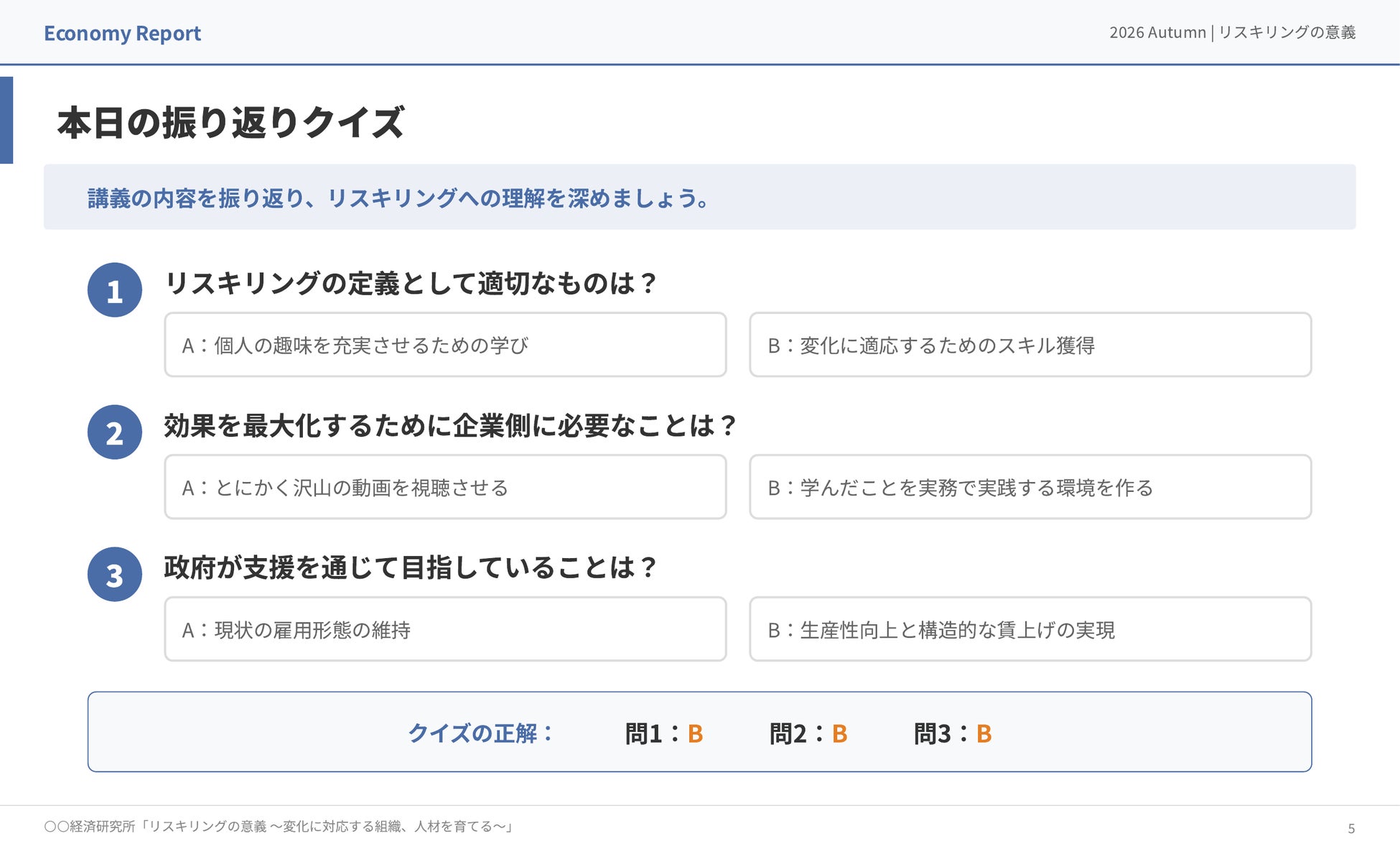 1つ目は「Eラーニング講座スライド」です。Eラーニング受講者を対象としたサンプルスライドで、講座内容に加え、理解度チェックのクイズを含むスライドを生成できます。Eラーニング事業者にとって、コース数の拡充や教材の定期改訂は受講者獲得に直結する一方で、1コースごとのスライド作成に手間がかかり、コンテンツ担当者の制作キャパシティがボトルネックになりがちです。本サンプルを活用すれば、カリキュラムPDFや講座シラバスを素材として投入するだけで講座スライドが生成され、新コース立ち上げや教材改訂のスピードを大幅に向上させることが可能です。