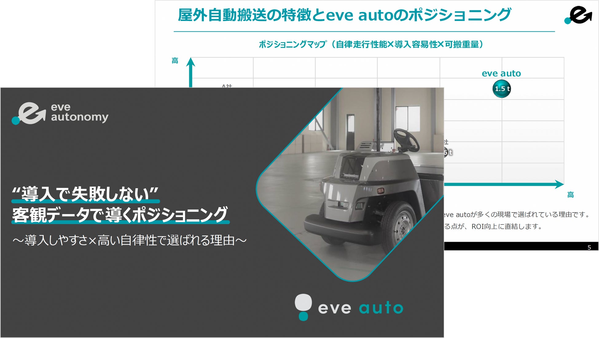 株式会社eve autonomy(イヴオートノミー、静岡県磐田市、代表取締役CEO:星野亮介、以下「eve autonomy」)は、自動運転EVを活用した屋外対応の無人搬送サービス「eve auto」の市場におけるポジションを客観的に整理した資料「屋外自動搬送の最適解 ― 導入しやすさ × 高い自律性で選ばれる理由」を公開しました。