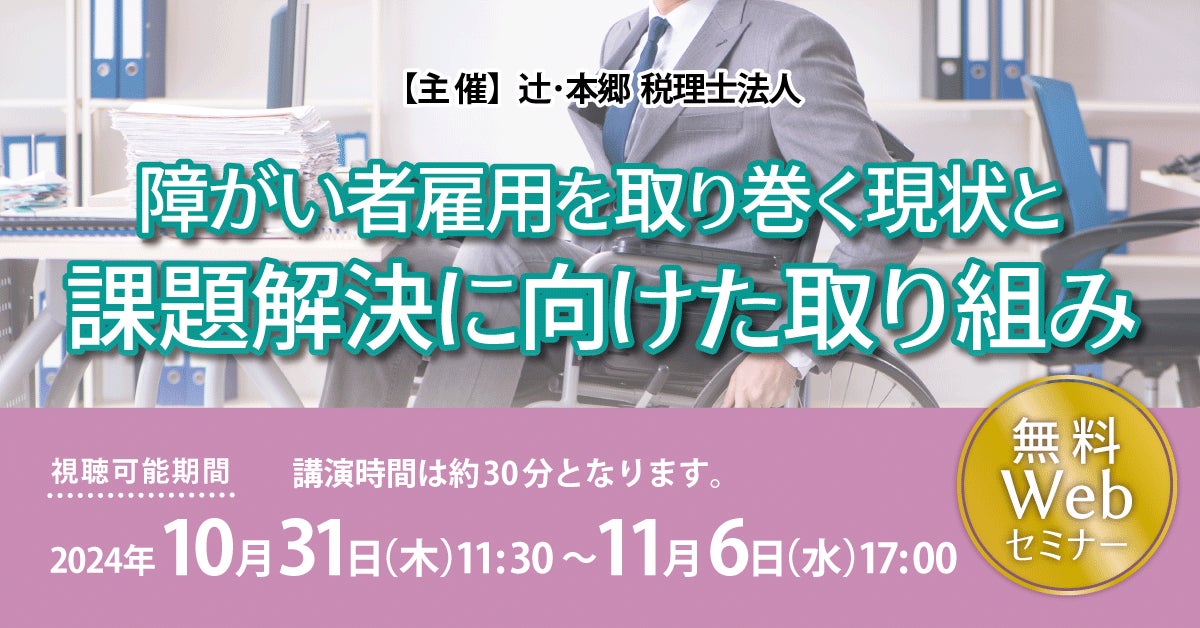辻・本郷 税理士法人(本社:東京都新宿区、理事長:徳田孝司)は、2024年10月31日(木)より「障がい者雇用を取り巻く現状と課題解決に向けた取り組み」セミナーを開催いたします。2024年の法改正に伴い、障がい者の雇用率が未達成の企業が増えることが予想されます。本セミナーでは、障がい者雇用に関する法的枠組みと、企業が遭遇している課題を、どのように解決していくべきか、取り組み事例を交えて紹介します。