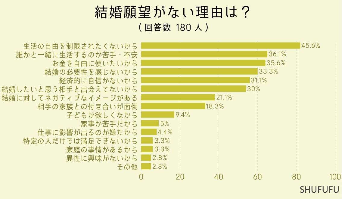 自分の暮らしのペースが確立されていて、それを結婚により制限がされ自由が奪われるのが嫌だという意見が多かったです。現在の生活に不満が無い分、生活の変化はストレスに感じる不安の方が多いのかもしれません。