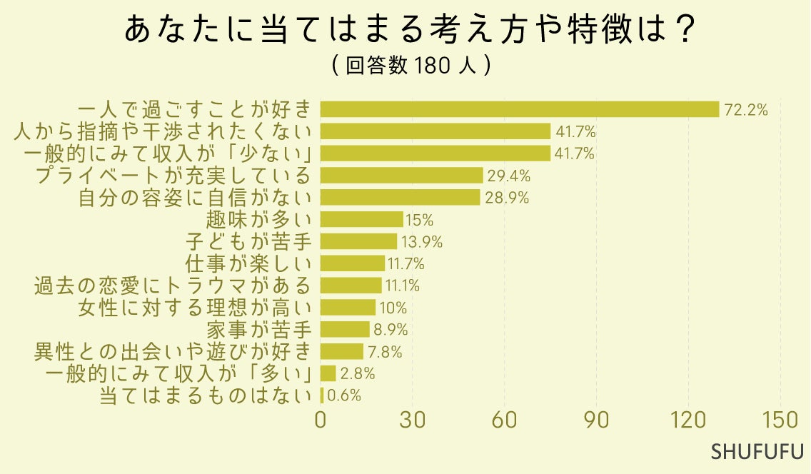 あなたに当てはまる考え方や特徴は?(複数可)の問いに対して最も多かったのが「一人で過ごすことが好き(72.2%)」でした。 次いで「人から指摘や干渉されたくない(41.7%)」「一般的にみて収入が「少ない」(41.7%)」という結果でした。