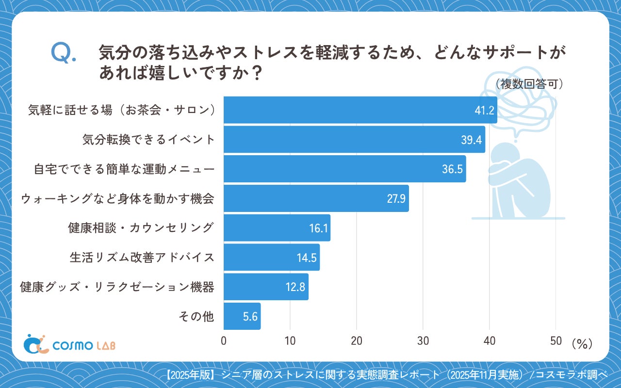 ストレスの改善に向けて望む支援は「気軽に話せる場(お茶会・サロン)」(41.2%)が最多でした。さらに「気分転換できるイベント」(39.4%)、「自宅でできる簡単な運動メニュー」(36.5%)という回答が続きました。交流と軽い運動が軸だと分かりました。