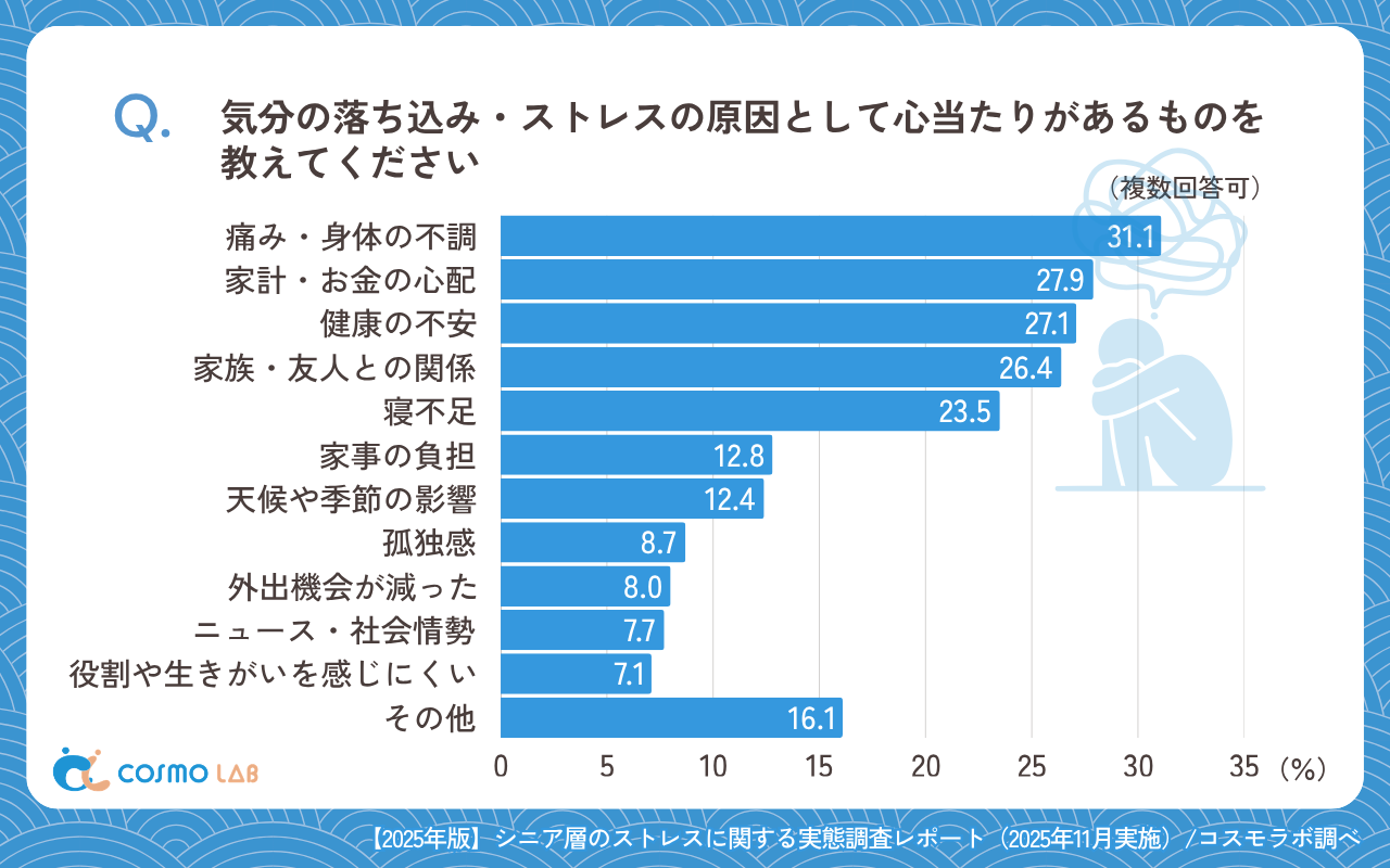 原因は「痛み・身体の不調」(31.1%)が最多で、「家計・お金の心配」(27.9%)、「健康の不安」(27.1%)、「家族・友人との関係」(26.4%)と続きました。