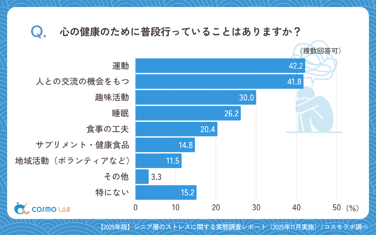 「運動」(42.2%)と「人との交流の機会をもつ」(41.8%)という回答が、同水準で上位となりました。このことから、日常の行動習慣で心の安定をはかる姿勢が明らかになりました。