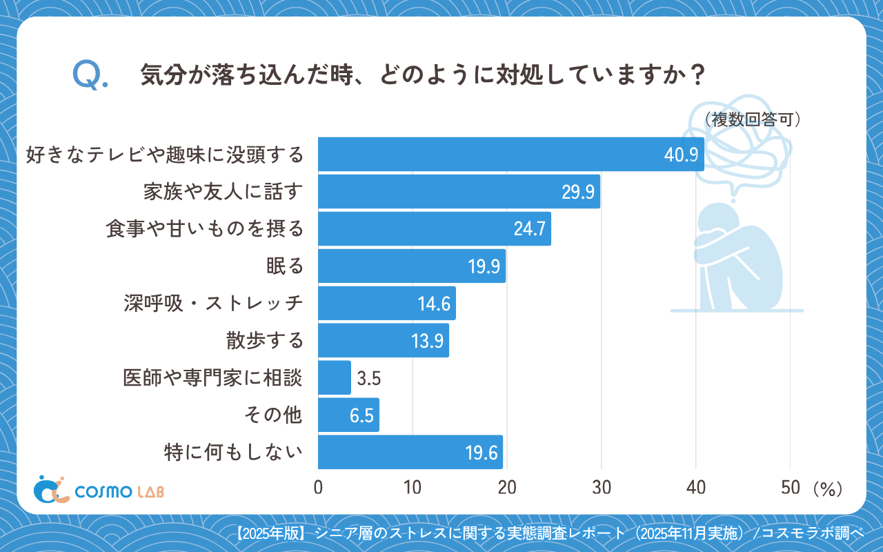 「好きなテレビや趣味に没頭する」(40.9%)と回答した層が最多で、「家族や友人に話す」(29.9%)が続きました。