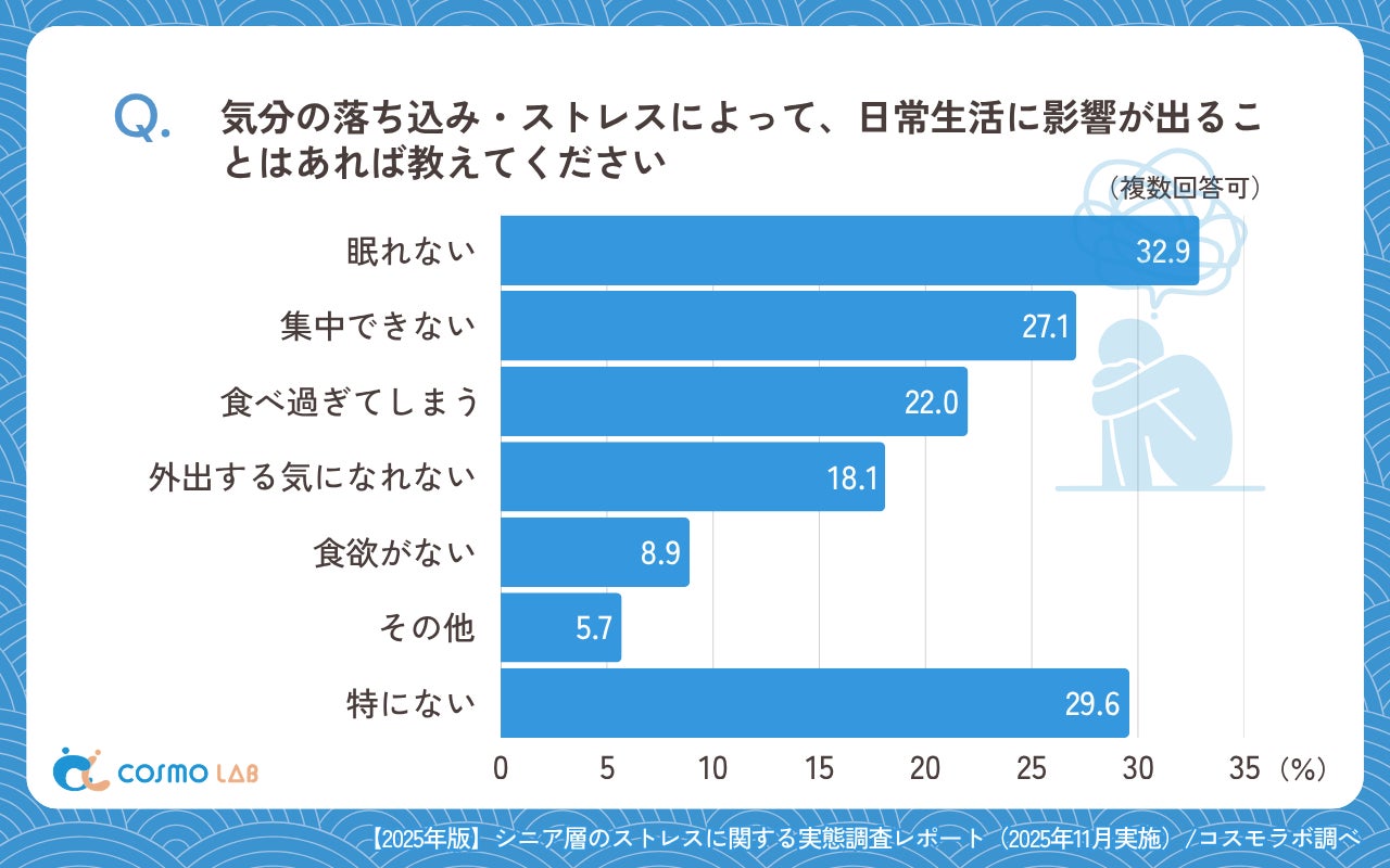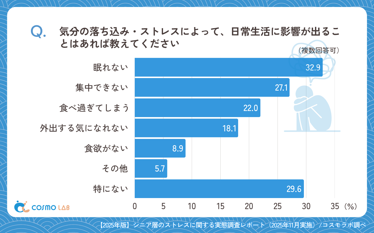 生活への影響は「眠れない」(32.9%)、「集中できない」(27.1%)が上位となりました。「食べ過ぎてしまう」(22.0%)も一定の割合で見受けられ、睡眠と食行動に影響が出ています。