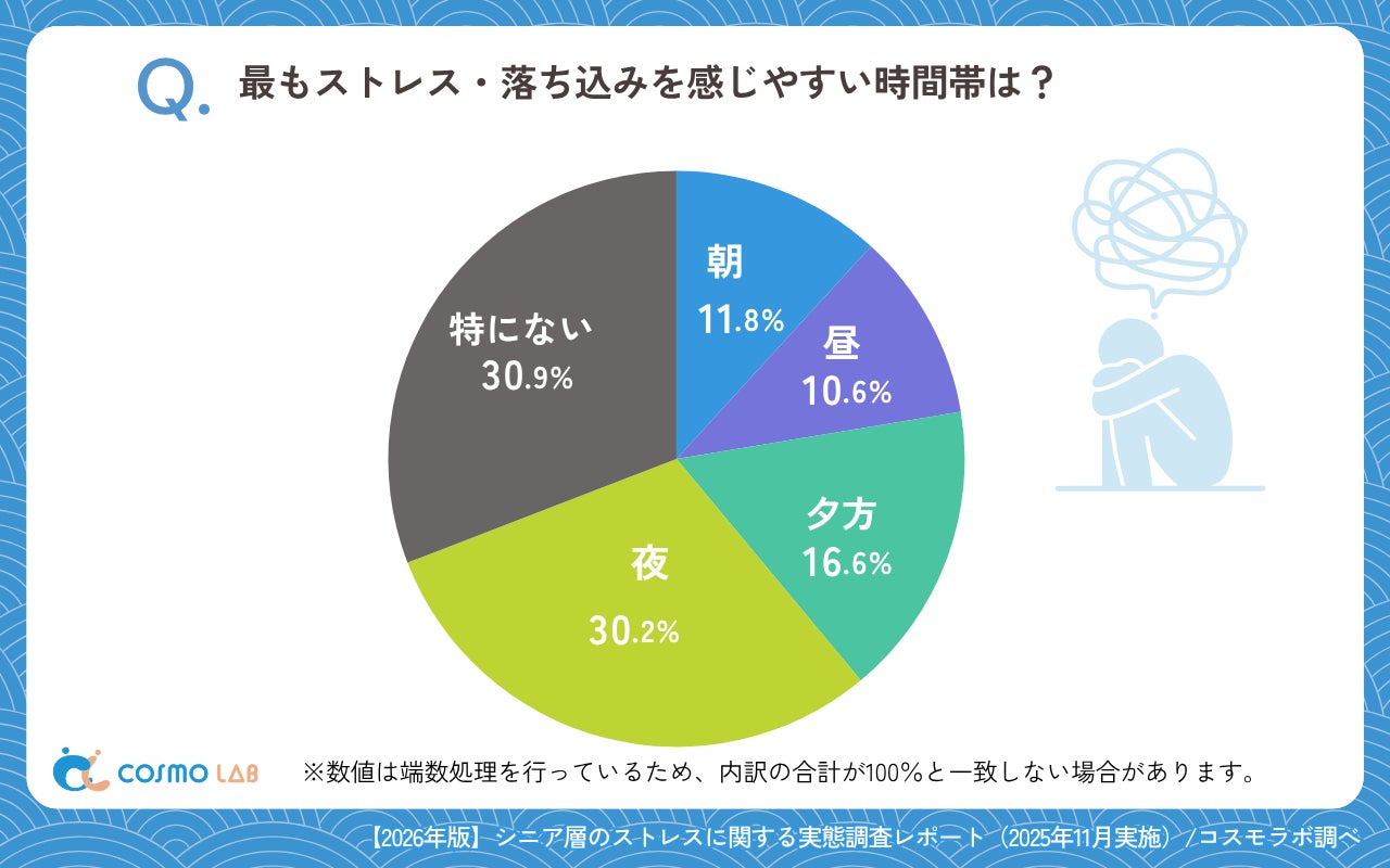 ストレスや落ち込みを感じやすい時間帯に、偏りがない層が一定数見られる一方で、夜間に感じやすい層も同規模で存在することが明らかになりました。