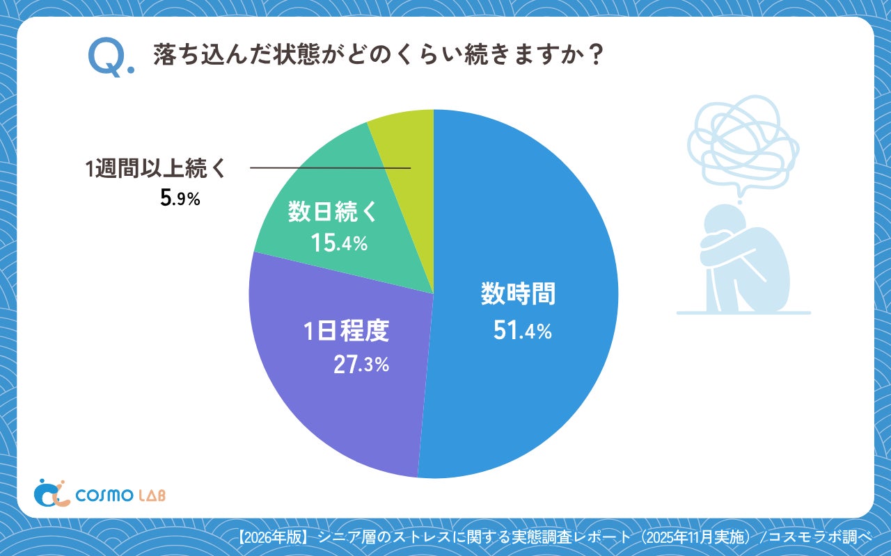 落ち込みが続くのは「数時間」(51.4%)が多数、さらに「1日程度」(27.3%)が続き、短時間で収束するケースが中心です。しかし「数日続く」(15.4%)と「1週間以上続く」(5.9%)も見られ、長引く層に向けた支援も必要です。