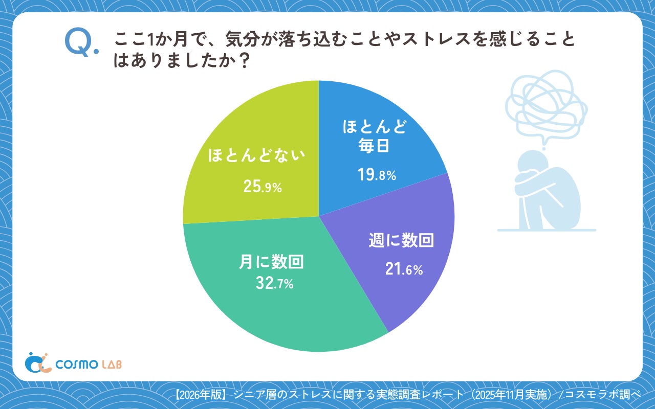 シニア専門のマーケティングプラットホーム コスモラボ(会社名:コスモヘルス株式会社、本社:東京都港区、代表取締役社長 小塚 崇史)がシニア層の『ストレス』に関するアンケートリサーチのレポートをリリースしました。本レポートでは、シニア層を対象に「ストレス・気分の落ち込み」に関するアンケート調査の結果を分析しました。