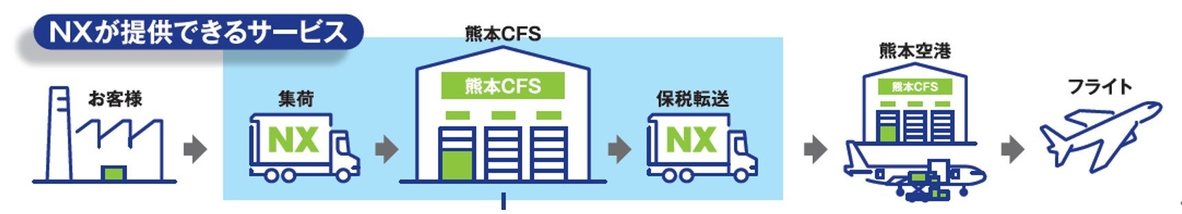 熊本CFSと「NX熊本益城ロジスティクスセンター」を核に、半導体倉庫である「NX鳥栖ロジスティクスセンター」および「NX博多アイランドシティグローバルロジスティクスセンター」を連携。梱包・保管・クロスドックまで、豊富な半導体物流の実績と知見を有するNXグループが、一気通貫で提供します。