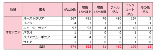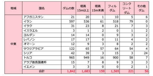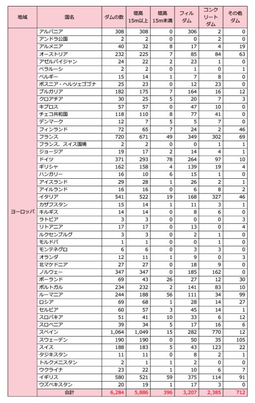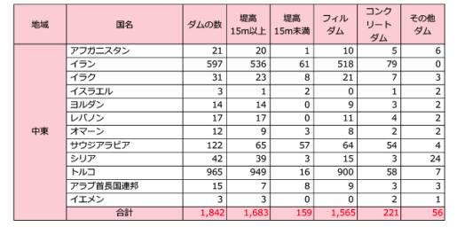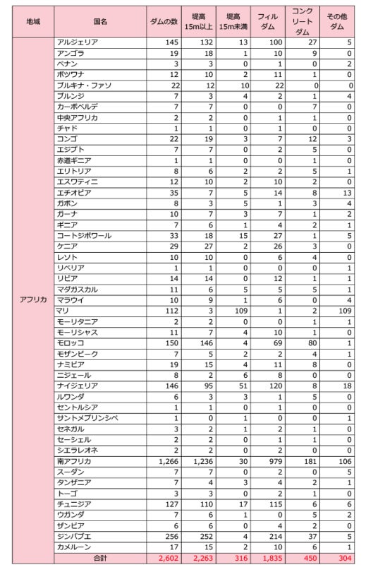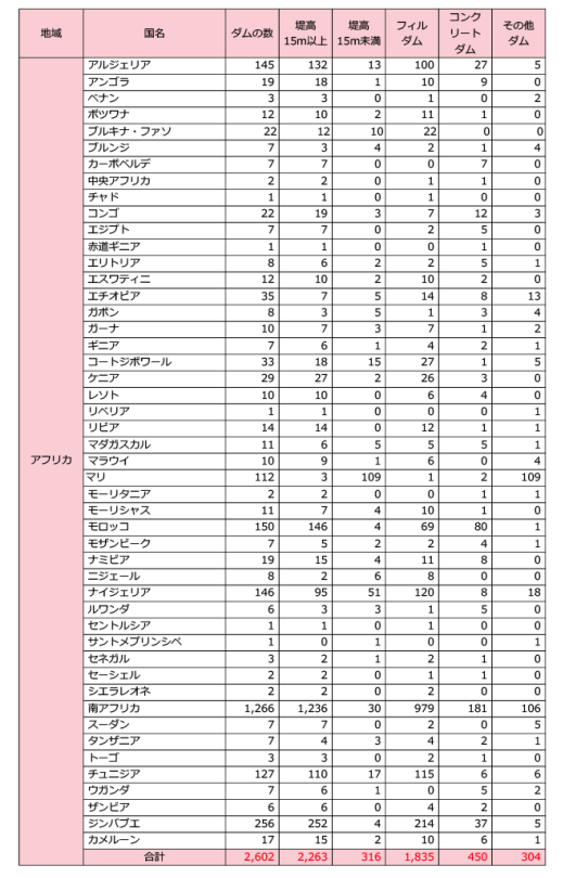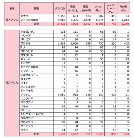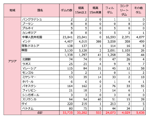 地域別に見ると、アジアが最も多くのダムを有していて約34,000基、南北アメリカで約14,000基、ヨーロッパが約6,300基、アフリカが約2,600基、中東が約1,800基となっています。