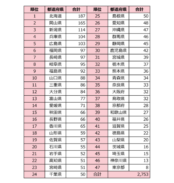 一般社団法人日本ダム協会によれば、表1に示すように、日本のダムは2,753基あり、 北海道がそのうちで最も多く187基あります。2番目に多いのが岡山県で、以下、新潟、兵庫、広島と続きます。