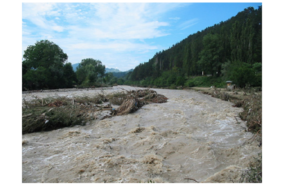 大雨が降った時に、ダムに水をためて下流に流す量を調節し、鉄砲水(図3)による堤防の決壊などを防ぐ。