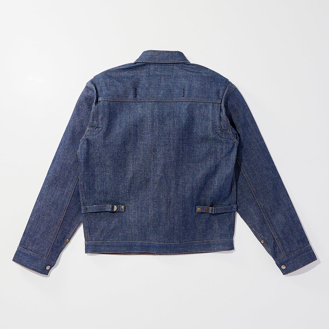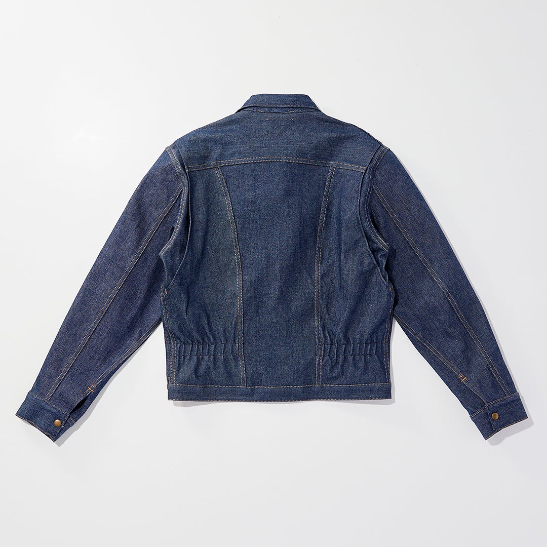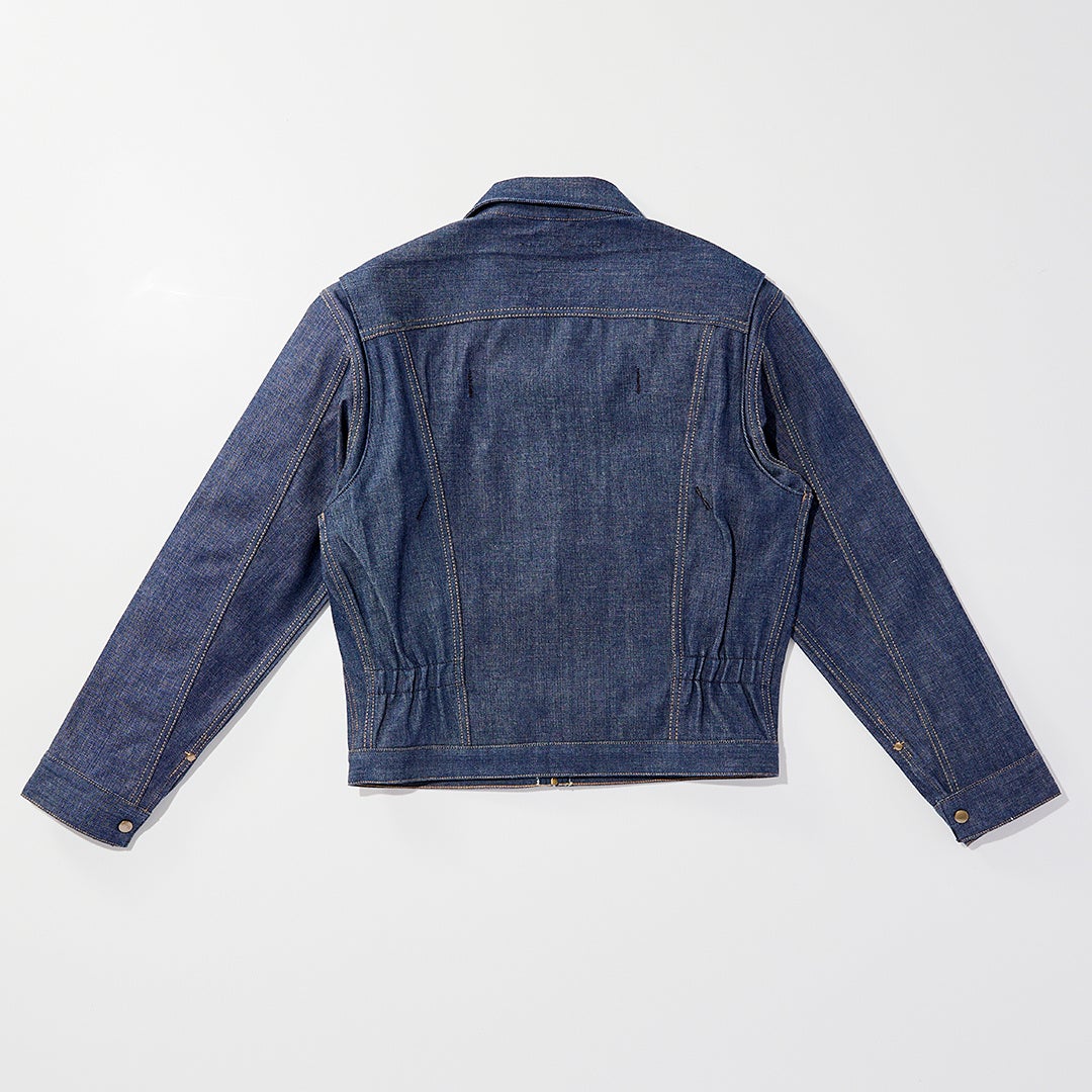 身頃に2つのスラッシュポケット、左胸にスナップボタン留めのフラップポケットなど、同時代の平均的なデニムジャケットにはない独創的なディテールが目を引く。そして最も特徴的であるのがフロントの合わせがトップのみボタンで、メインにはジッパーを用いている点であろう。その利便性やフィッティングをアシストするように背中には左右3本ずつのエラスティックバンドが施され、またそのフィット性の高さから、"丸カン"を配したプリーツはシングルへと簡素化されている。それらのディテールすべてが斬新なデザインである。