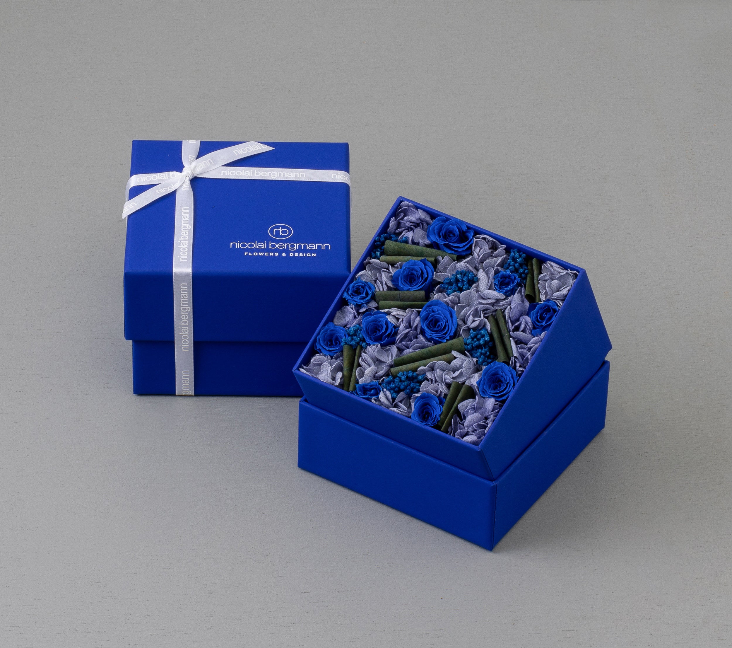 100個限定の「セイリングブルー」プリザーブドフラワーボックス。横浜の海をイメージした青く美しい限定ボックスに、ユーカリの葉や繊細な紫陽花、そして深いブルーに染められたローズが輝く大人なフラワーギフトに仕上げました。