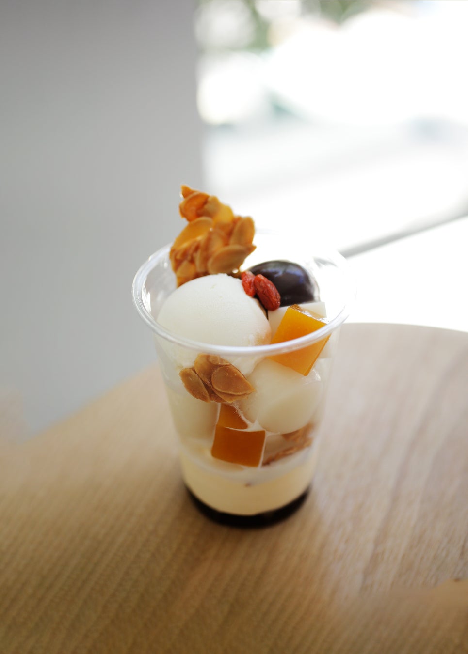 独特の風味を持つ杏仁霜えを使った杏仁クリームと杏仁寒天に、あんず寒天、クコの実を合わせました。トッピングには香ばしく焼き上げたアーモンドチュイルを添えています。