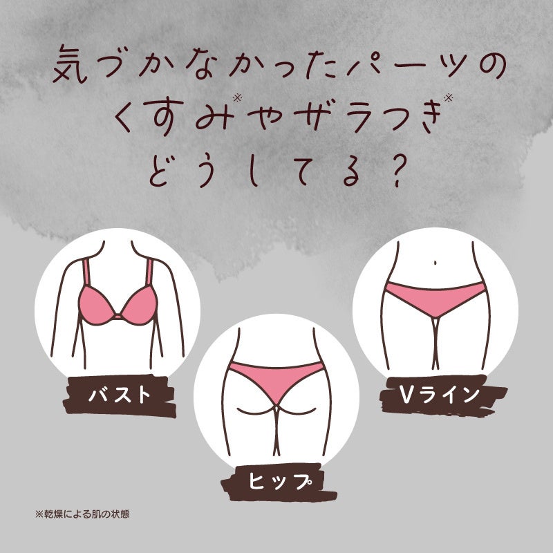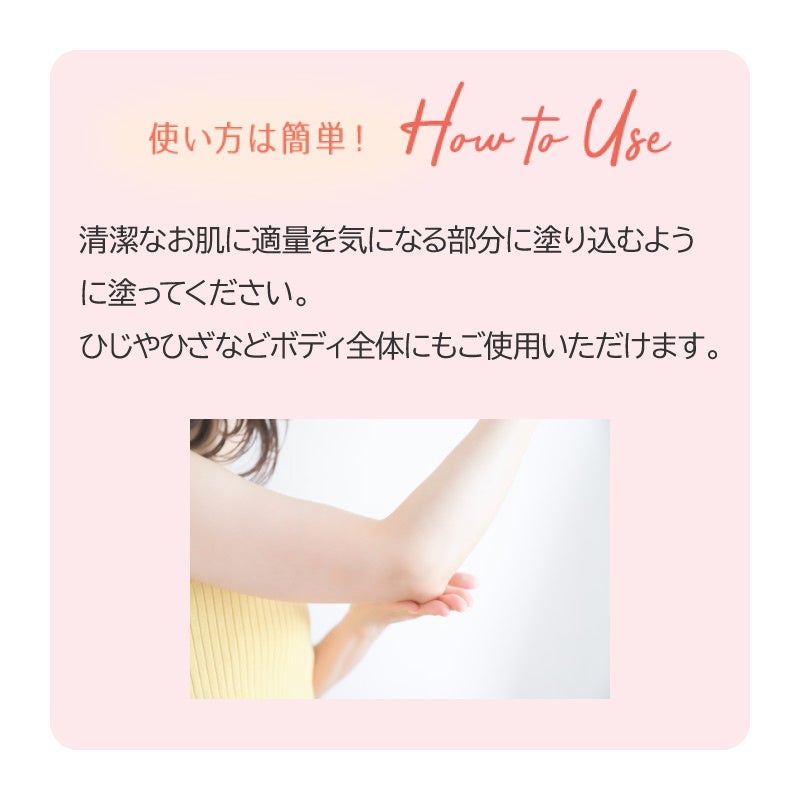 バスト、ヒップ、Vラインの他にひじやひざなどのくすみが気になる箇所に塗るだけ!