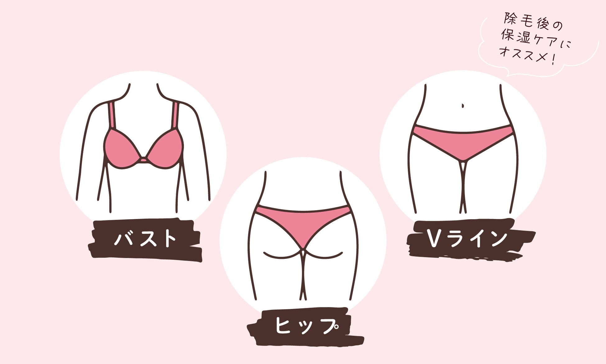 バストやヒップ、Vラインなどお肌のデリケートな箇所はもちろん、ひじやひざなどボディ全体にお使いいただけます。