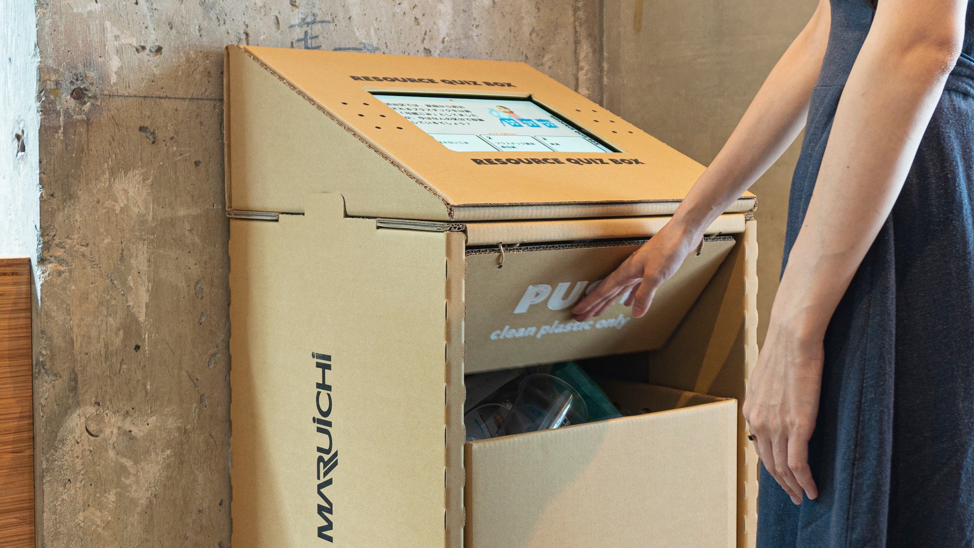 「Resource quiz box-クイズ!プラスチック資源箱-」は、プラスチック資源を楽しく分別することを目指して制作された資源箱です。この資源箱にプラスチック資源を分別して捨てると、プラスチックの分別方法や社会的な課題に関する問題が出題されます。クイズを通してゲーム感覚で分別ルールを楽しく学び、プラスチックリサイクルへの意識を高めることができます。ごみ箱型の筐体も、リサイクル可能な資源であるダンボールだけで制作されました。「学び」という発見の中から、プラスチック資源との理想の向き合い方を考えるきっかけを創出します。