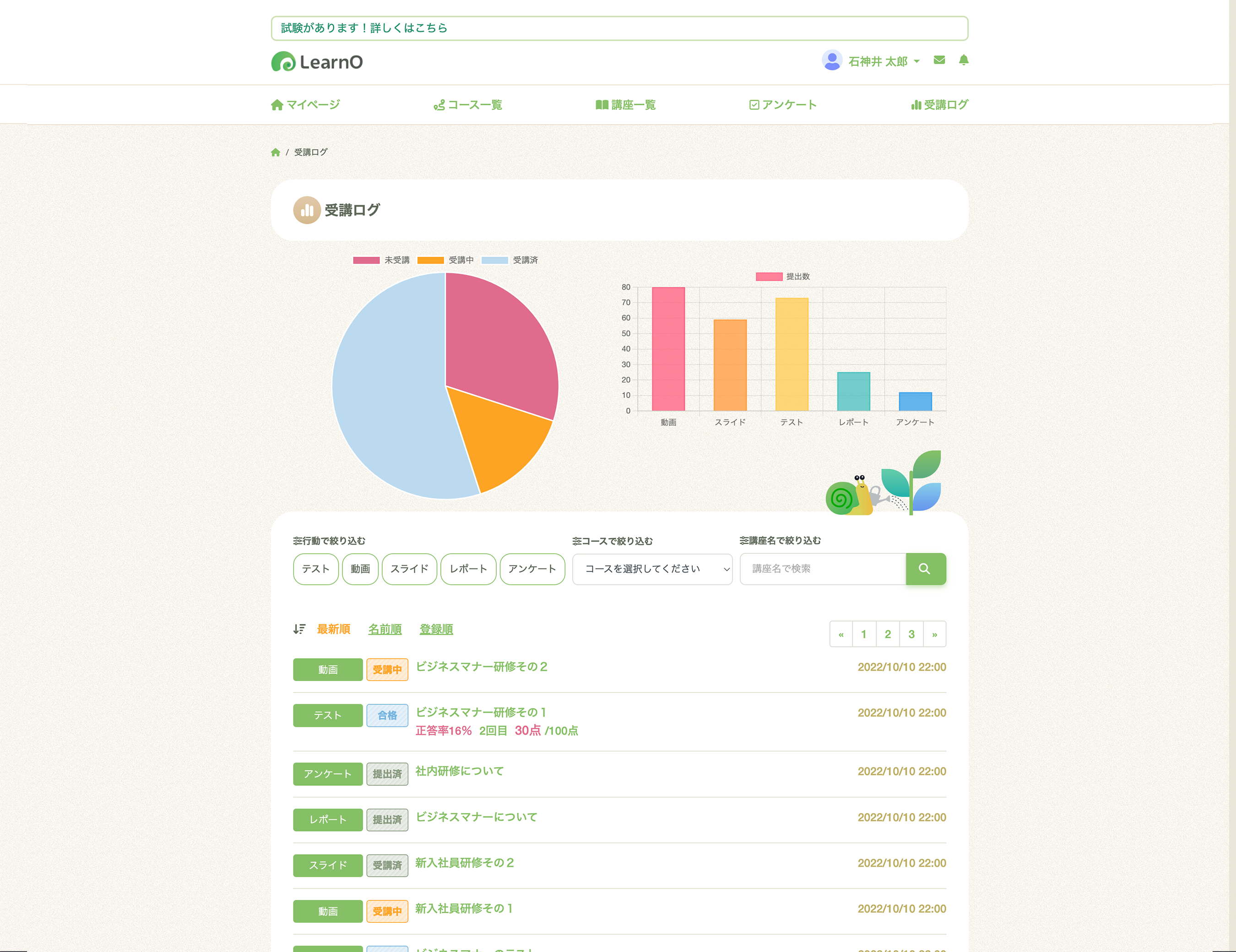 「受講ログ」のページを新たに用意し、受講履歴を確認することができます。