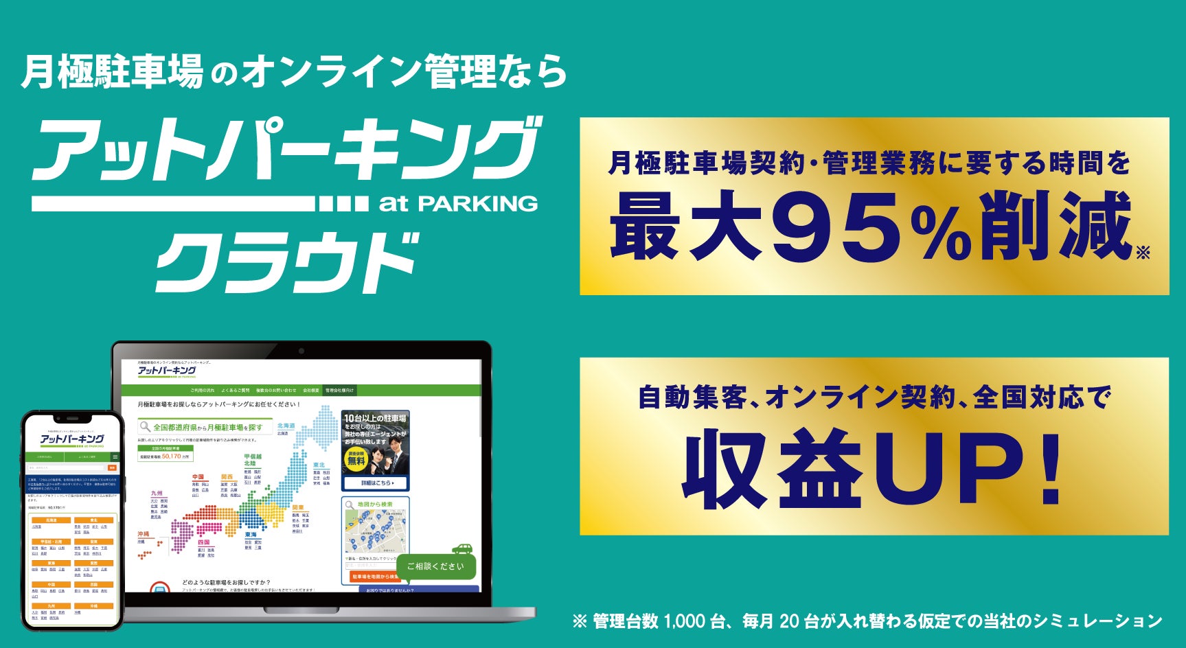 アットパーキングクラウドは、月極駐車場の管理業務を最大95%(※)削減し、圧倒的な集客力で稼働率を向上させる不動産会社向けの月極駐車場オンライン管理システムです。